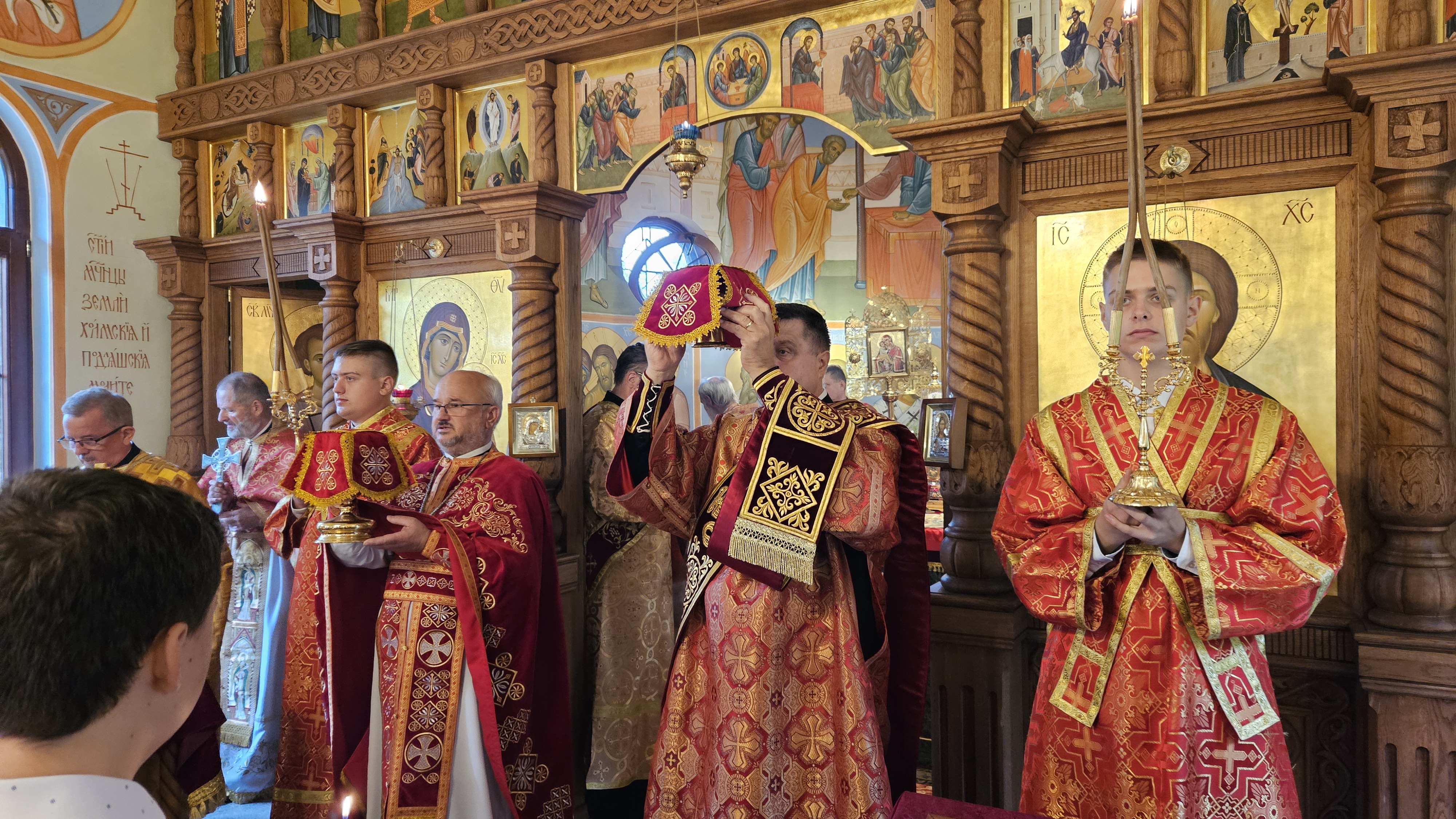 W dzień świąteczny 06. września 2025 obchody związane z głogowskim świętem parafialnym rozpoczęły się o godz. 09.3o przywitaniem Jego Ekscelencji JERZEGO, Prawosławnego Arcybiskupa Wrocławskiego i Szczecińskiego. W pierwszej kolejności Władykę przed wejściem do świątyni przywitały dzieci i młodzież z głogowskiej parafii, którzy wręczając bukiet kwiatów prosili Arcybiskupa o błogosławieństwo. Następnie, u progu cerkwi, chlebem i solą powitali Władykę przedstawiciele rady parafialnej, także prosząc Arcypasterza o modlitwę za wiernych. Kolejno, wewnątrz świątyni, Ekscelencję przywitał Ks. Proboszcz, który prosił o przewodniczenie dzisiejszym uroczystościom i usilną modlitwę za wszystkich. O godz. 10.00 rozpoczęła się Św. Liturgia sprawowana przez Ordynariusza Diecezji Arcybiskupa Jerzego, w której udział wzięli bardzo licznie przybyli na głogowskie święto duchowni naszej diecezji, także spoza okolicznych parafii, pokonując nawet kilkaset kilometrów, tj. ks. mitrat Lubomir Worhacz - Parafia Prawosławna w Legnicy, Dziekan Dekanatu Lubińskiego, ks. mitrat Igor Popowicz - Parafia Prawosławna w Przemkowie, Dziekan Dekanatu Zielonogórskiego, ks. mitrat Eugeniusz Bójko - Parafia Prawosławna Śww. Cyryla i Metodego we Wrocławiu, ks. mitrat Piotr Sokołowski - Katedralna Parafia Prawosławna we Wrocławiu, ks. mitrat Marek Bonifatiuk - Parafia Prawosławna w Zgorzelcu, ks. prot. Sławomir Sorokanycz - Parafia Prawosławna w Studzionkach, ks. prot. Andrzej Dudra - Parafia Prawosławna w Zielonej Górze, ks. prot. Bogdan Repeła - Parafia Prawosławna w Lubinie, ks. prot. Michał Koval - Parafia Prawosławna w Słubicach i Torzymiu, ks. ihumen Jerzy Omelianiuk - Parafia Prawosławna w Buczynie, ks. - rezydent Parafia Prawosławna w Ługach i Brzozie, ks. Paweł Gocko - Parafia Prawosławna w Malczycach, ks. protod. Mieczysław Oleśniewicz - Katedralna Parafia Prawosławna we Wrocławiu, Kanclerz Arcybiskupa, ks. protod. Dymitr - Parafia Prawosławna w Zgorzelcu. Słowo na Św. Liturgii do zgromadzonych wygłosił ks. mitrat Lubomir Worhacz. Przybliżył on zebranym wędrówkę życiową Świętego Maksyma i Jego zamierzone i całkiem świadome wybory podążania za Chrystusem ciężką i wąską ścieżką. Nawiązał także do faktu, iż tutejsza parafialna cerkiew prawosławna jest jedyną w Polsce, a najpewniej i jedyną na świecie świątynią, konsekrowaną w pamięć Św. Maksyma. I w ten szczególny dzień wszyscy zebrani łączymy się w jedności modlitewnej z Gorlicami, miejscem śmierci głogowskiego Patrona, ale i miejscem, w którym także w dniu dzisiejszym, w cerkwi katedralnej Św. Trójcy w Gorlicach, wybudowanej, jako symbol przywiązania prawosławnych Łemków do wiary swoich przodków i jednocześnie pomnik męczeńskiej śmierci Św. Maksyma, odbywają się uroczystości ku Jego czci.