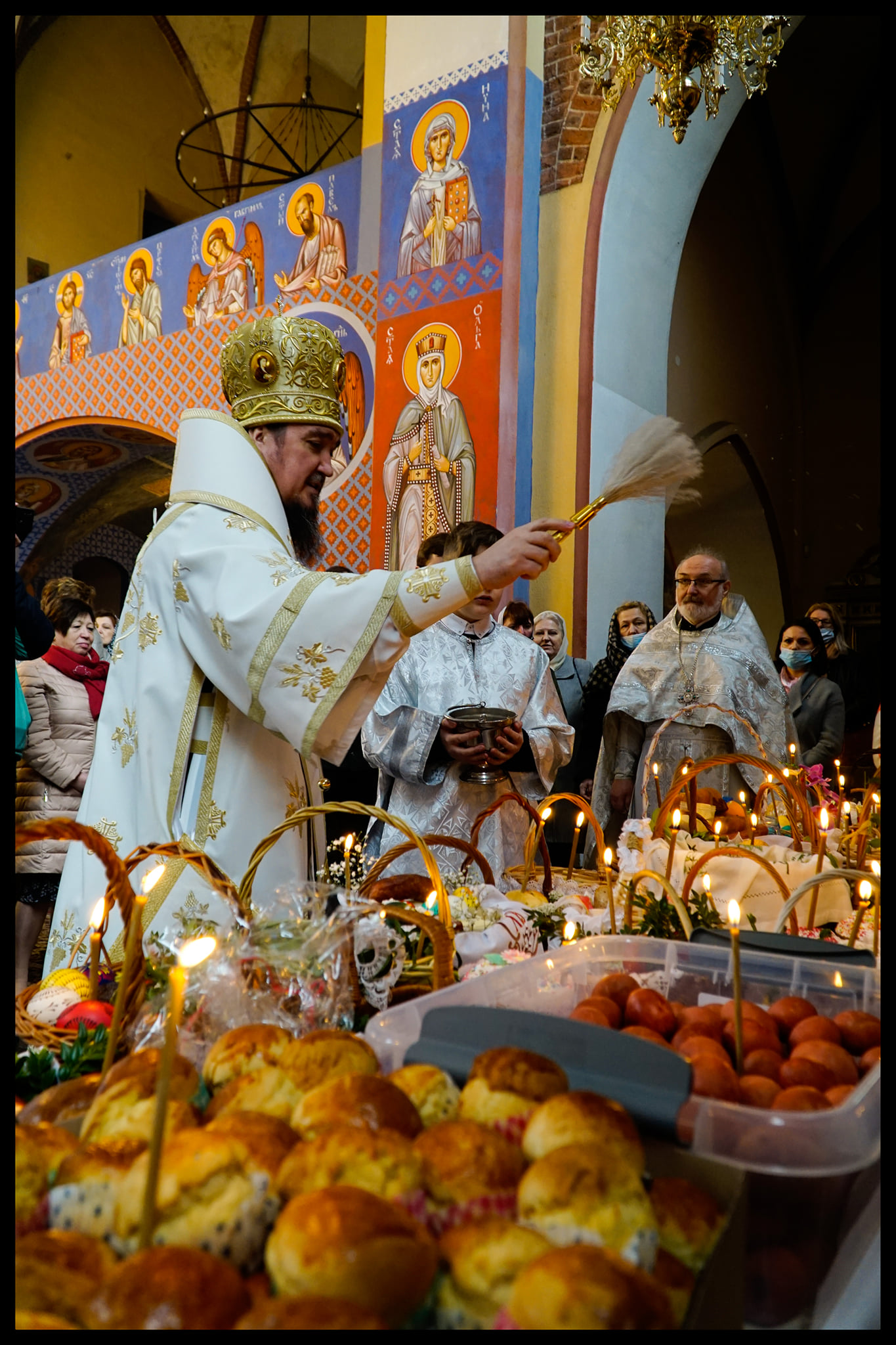 Po św. Liturgii Władyka Jerzy pobłogosławił chleby i wino, a następnie poświęcił przyniesione przez wiernych pokarmy paschalne.