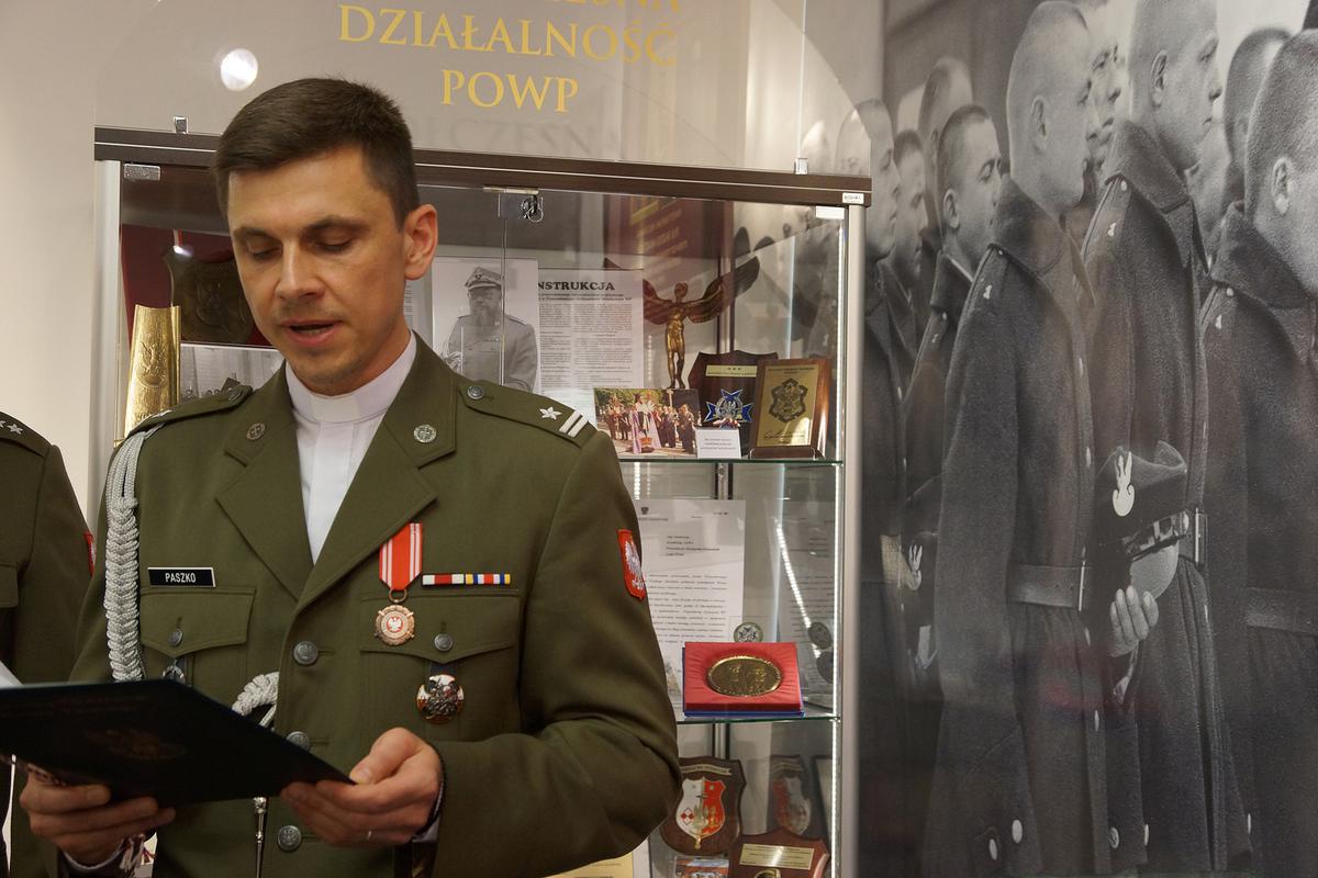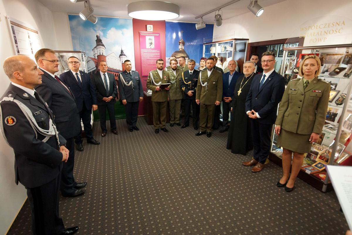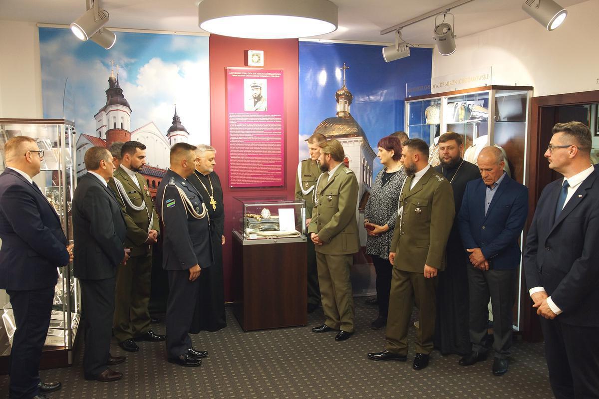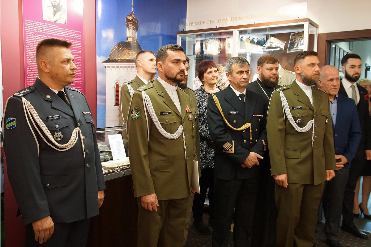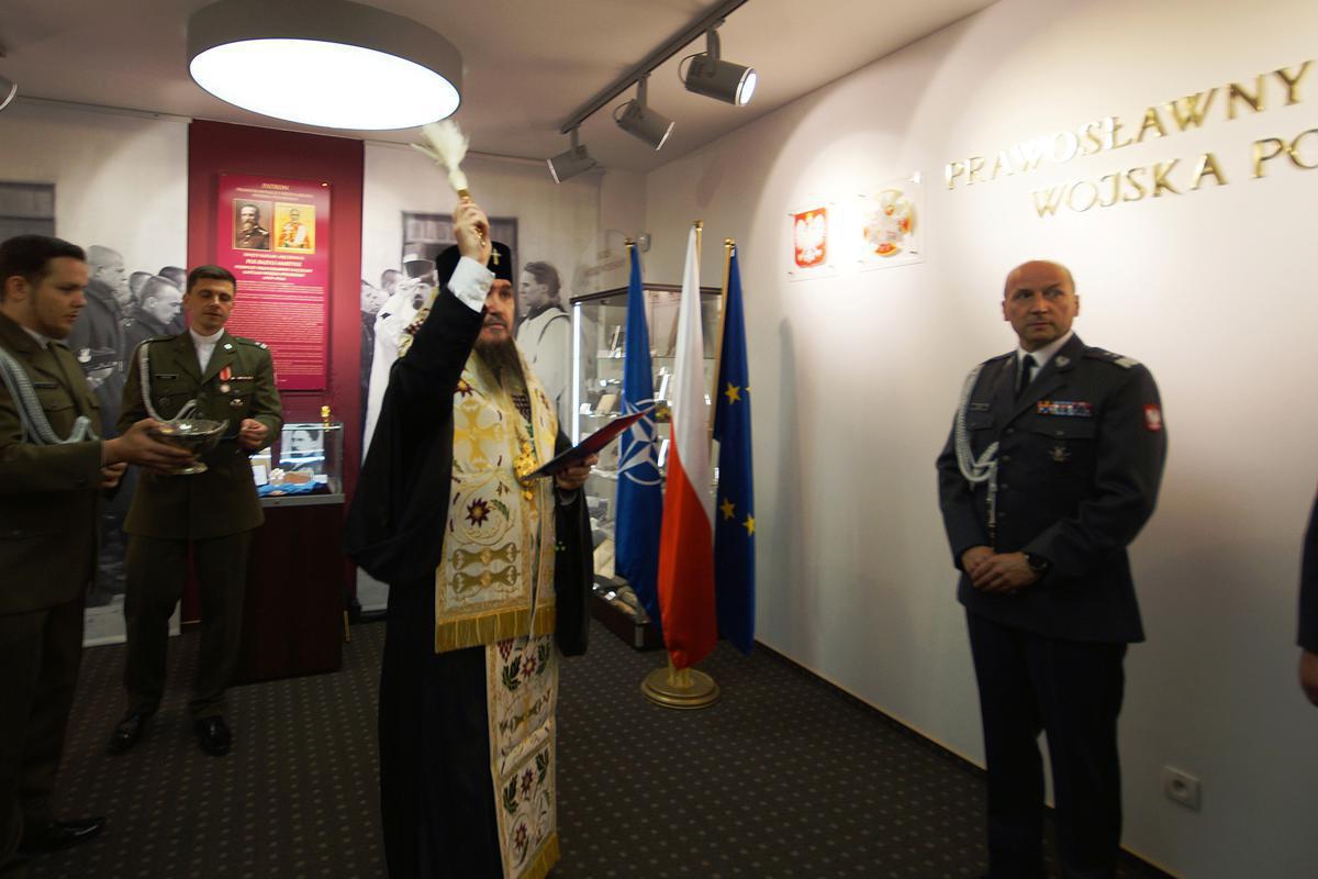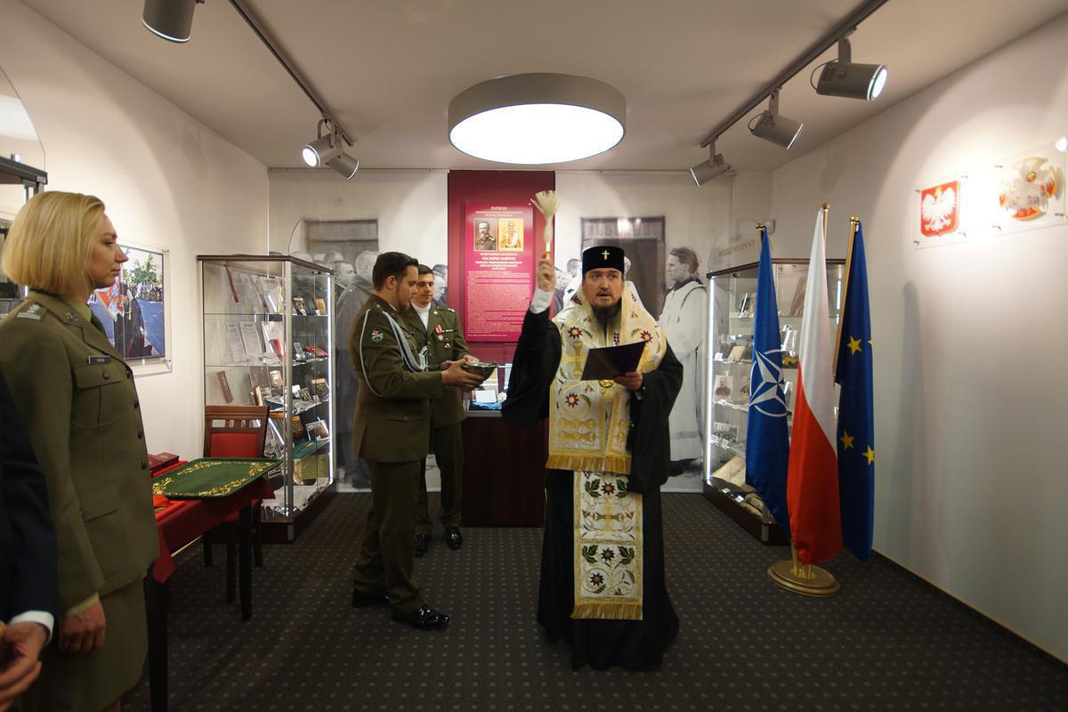 Następnie prowadzący uroczystość ks. mjr Tomasz Paszko Dziekan Wojsk Obrony Terytorialnej, który był koordynatorem projektu i wykonania prac w Sali Tradycji Prawosławnego Ordynariatu Wojska Polskiego, opowiedział i oprowadził szanownych gości po sali.