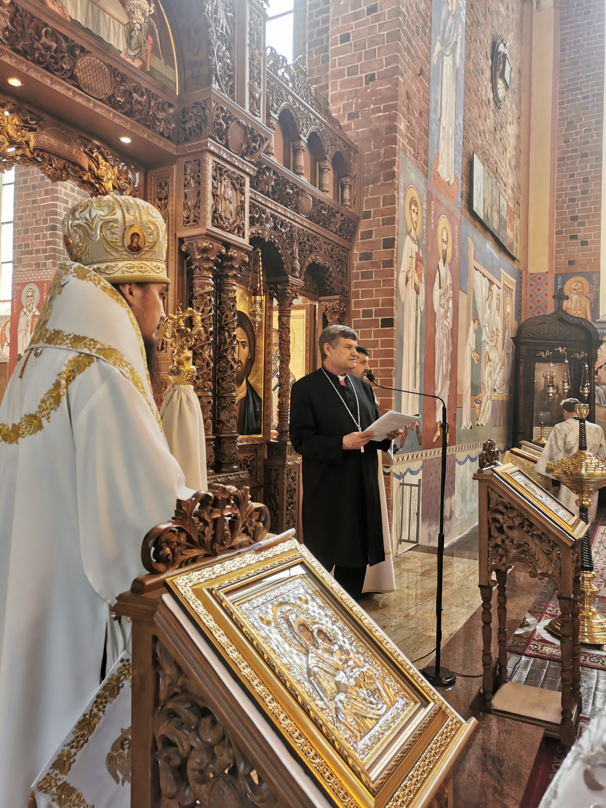 Po zakończeniu modlitwy ze słowem do zebranych zwrócił się abp Jerzy. Władyka określił o. Eugeniusza mianem jednego z filarów i budowniczych Diecezji Wrocławsko-Szczecińskiej, zwracając szczególną uwagę na duchowy charakter zmarłego. Opisując ks. mitrata Eugeniusza Cebulskiego abp Jerzy podkreślał jego bezwarunkowe poświęcenie Bogu i służbie przed ołtarzem. Jego Ekscelencja podkreślił, że nie sposób oddać słowami wszystkich zasług o. Eugeniusza, niemożliwym jest streszczenie życia, gdyż było ono przepełnione służbą Bogu i ludziom na bardzo wielu polach i płaszczyznach. Ks. Eugeniusz pełnił w swoim życiu wiele funkcji, od proboszcza małych wiejskich parafii przez funkcję kanclerza kurii, na założycielu i wieloletnim proboszczu parafii św. Cyryla i Metodego na Wyspie Piaskowej kończąc. Podsumowując abp Jerzy określił o. Eugeniusza jako wzór dla kolejnych pokoleń duchownych. Kończąc, Władyka zwrócił się do wszystkich zebranych z prośbą o modlitwę, gdyż jak stwierdził jest ona jedynym autentycznym wyrazem pamięci i więzi ze zmarłym.