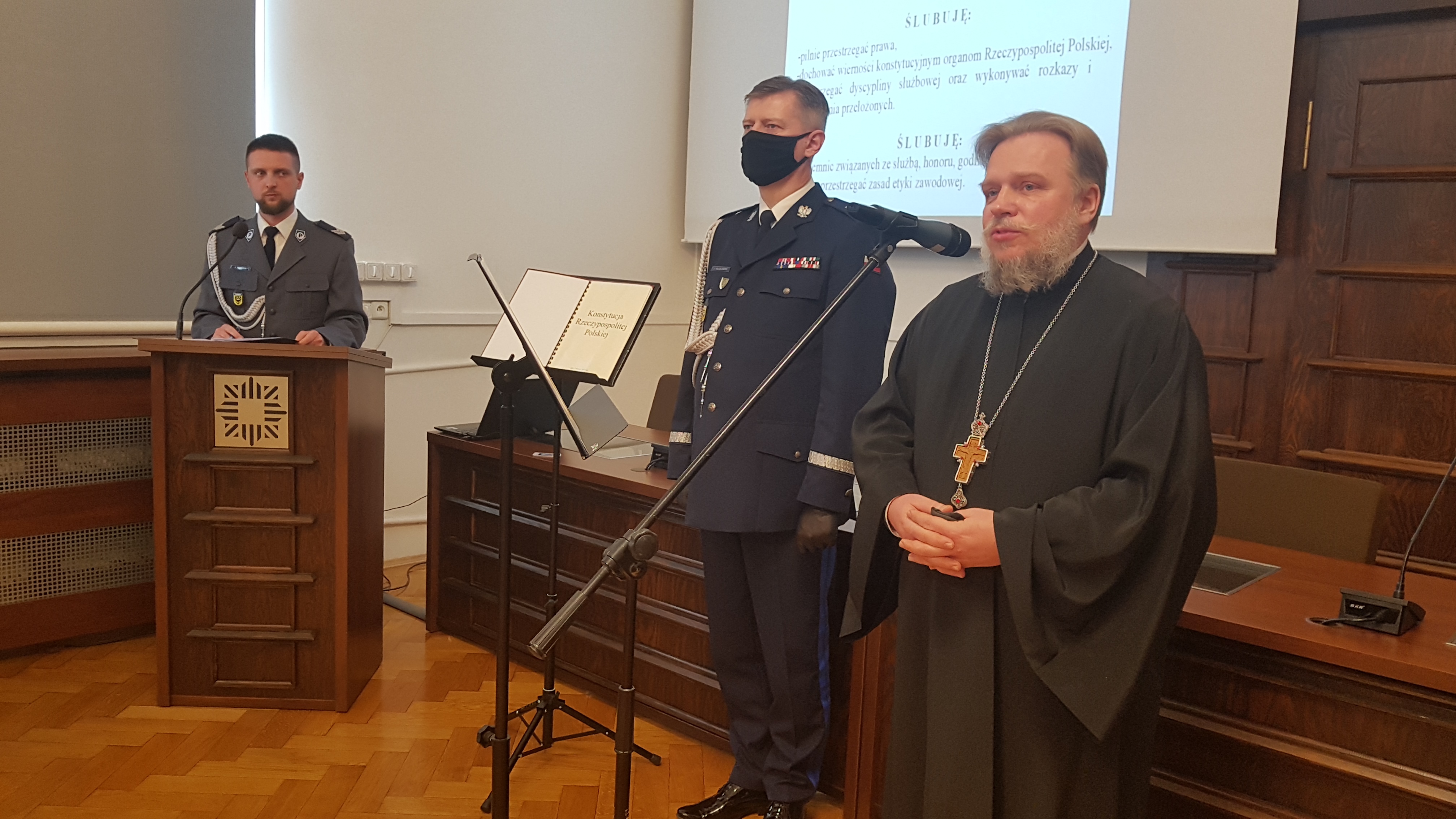 Nowi funkcjonariusze wypowiedzieli słowa roty ślubowania, po których nastąpiły okolicznościowe przemówienia oraz przesłanie duchowe kapelanów KWP: ks. Grzegorza Cebulskiego w imieniu Prawosławnego Duszpasterstwa Policji oraz ks. kanonika Stanisława Stelmaszka, wraz z udzieleniem błogosławieństwem.
