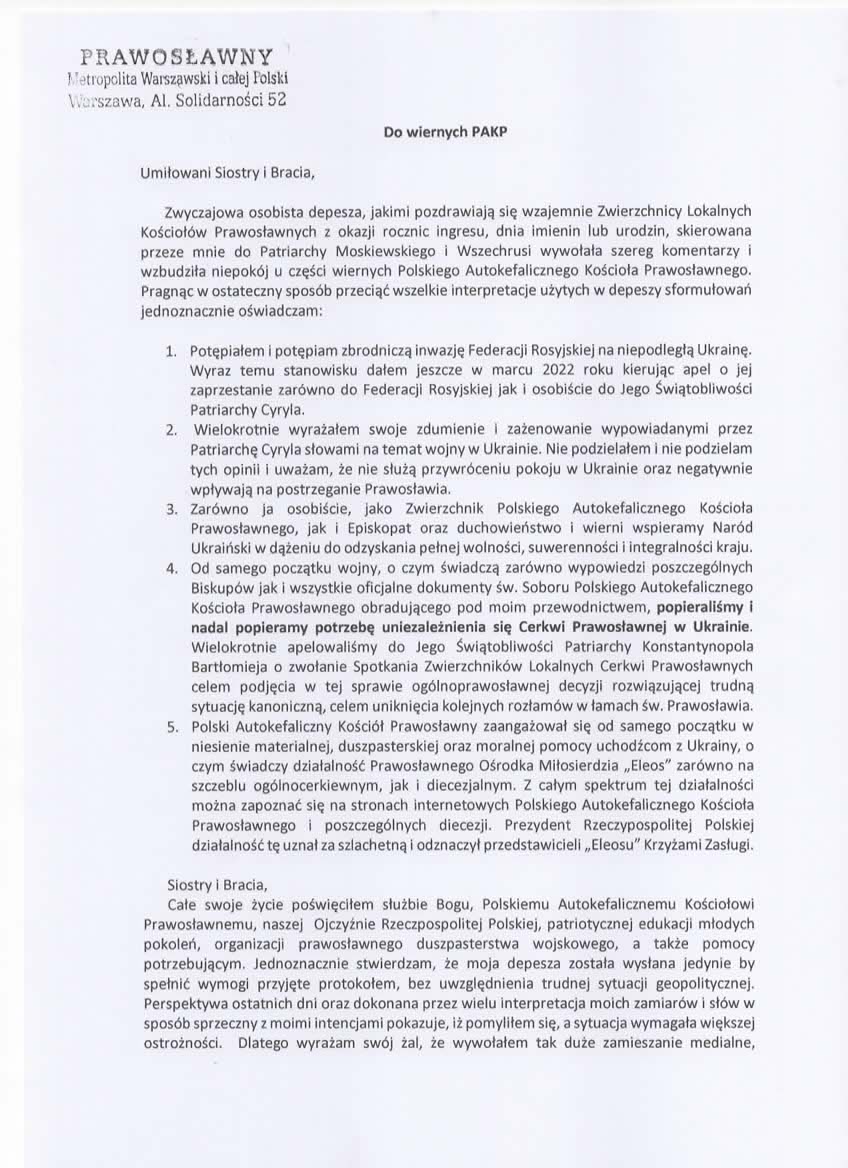 Całe swoje życie poświęciłem służbie Bogu, Polskiemu Autokefalicznemu Kościołowi Prawosławnemu, naszej Ojczyźnie Rzeczpospolitej Polskiej, patriotycznej edukacji młodych pokoleń, organizacji prawosławnego duszpasterstwa wojskowego, a także pomocy potrzebującym. Jednoznacznie stwierdzam, że moja depesza została wysłana jedynie by spełnić wymogi przyjęte protokołem, bez uwzględnienia trudnej sytuacji geopolitycznej. Perspektywa ostatnich dni oraz dokonana przez wielu interpretacja moich zamiarów i słów w sposób sprzeczny z moimi intencjami pokazuje, iż pomyliłem się, a sytuacja wymagała większej ostrożności. Dlatego wyrażam swój żal, że wywołałem tak duże zamieszanie medialne, narażające wspólnotę Polskiego Autokefalicznego Kościoła Prawosławnego na – niezasłużony przez Nią – ból.