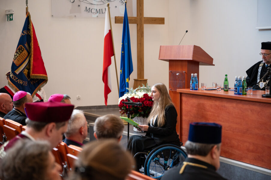 Następnie głos zabrała przedstawicielka studentów i doktorantów. Witając w murach naszej Uczelni nowych kolegów i koleżanki pani mgr Karolina Wyrwicz przytaczając słowa Janusza Korczaka: Nie takie ważne, żeby człowiek dużo wiedział, ale żeby dobrze wiedział, nie żeby umiał na pamięć, a żeby rozumiał, nie żeby go wszystko troszkę obchodziło, a żeby go coś naprawdę zajmowało, zaznaczyła, że nowoprzyjęci studenci naszej Uczelni stali się częścią społeczności akademickiej otwartej na interdyscyplinarny dialog, tolerancję i szacunek dla każdego człowieka.