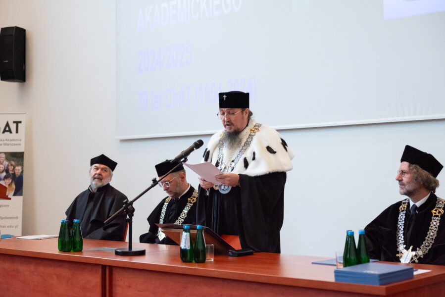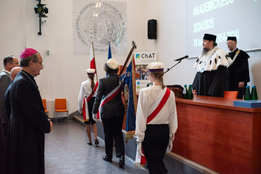 O godzinie 11:00 przy akompaniamencie Chóru Akademickiego ChAT pod kierownictwem prof. dr. hab. Włodzimierza Wołosiuka, zgodnie z wieloletnią tradycją, wyruszył uroczysty orszak reprezentantów uczelni warszawskich, władz rektorskich oraz dziekańskich Akademii inaugurujący rozpoczęcie uroczystości. Po wprowadzeniu sztandaru nastąpiło odśpiewanie hymnu państwowego, a JM abp prof. dr hab. Jerzy (Pańkowski), Rektor ChAT witając przybyłych zwierzchników Kościołów, przedstawicieli władz państwowych, dyplomatów, władz samorządowych, rektorów uczelni warszawskich, duchowieństwo, pracowników, absolwentów i studentów oraz przyjaciół naszej uczelni rozpoczął uroczystość Inauguracji Nowego Roku Akademickiego 2024/2025. Wyrażając jednocześnie słowa podziękowania adresatom listów gratulacyjnych, które napłynęły do Uczelni z okazji uroczystości rozpoczęcia nowego roku akademickiego.