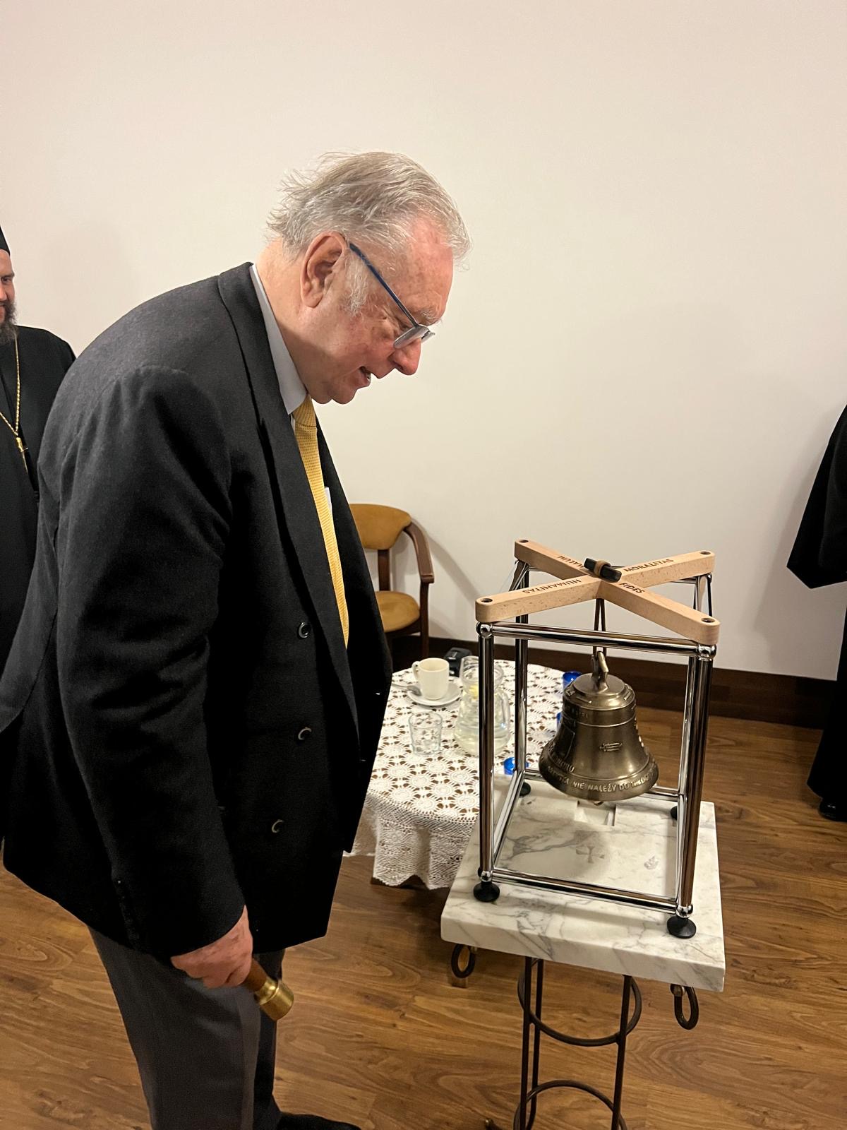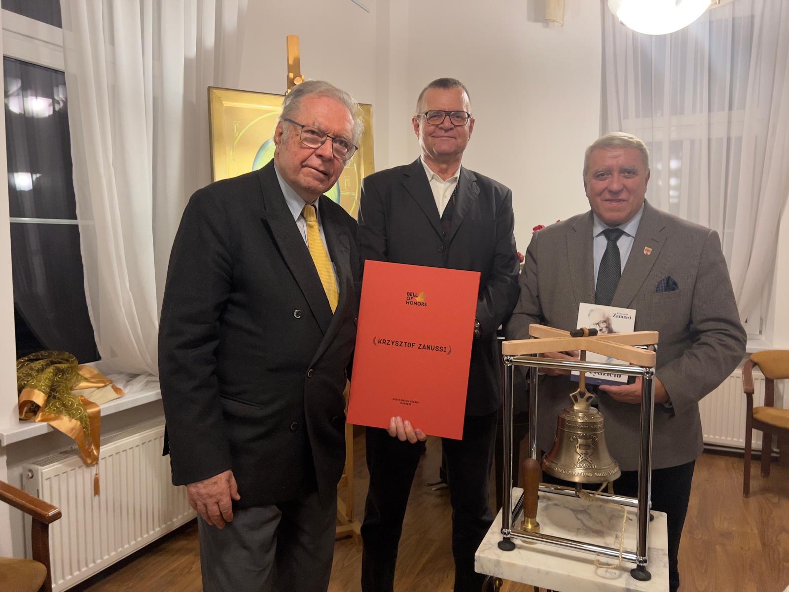 W odpowiedziach Pana Krzysztofa Zanussiego, wyszedł temat i rozważania na temat instytucji Kościoła jako takiego, a żywego Ciała Chrystusa, połączeń, apostazji dzisiaj i w końcu zagadka Świętych, świętości, żywej Ewangelii. Ojciec Jeremiasz otworzył też pytanie dotyczące lokalnych, polskich źródłeł świętości i roli Prawosławia w Polsce. Mając na względzie dostojny wiek i kondycję Gościa, po dwóch godzinach pytań i intensywnych odpowiedzi, miało miejsce wręczenie memorialnego Dzwonu Honoru i Wdzięcznej Pamięci za dokonania Pana Krzysztofa Zanussiego, którego donatorem i pomysłodawcą był Pan Waldemar Płusa – Prezes Fundacji „Cztery Strony Kultury”, poeta, fotograf, muzyk animator ogólnopolskich inwencji kulturalnych. Uczestnikiem spotkania był też Burmistrz Mieroszowa Pan Andrzej Lipiński, wraz z działaczami sołectwa Sokołowsko, duchowni i przyjezdni goście nawet z Warszawy. Po wspólnej agapie i modlitwach wieczornych o. Grzegorz Cebulski wręczył zacnemu gościowi certyfikowany krzyż wykonany z 3tys letniego czarnego dębu wydobytego z Wisły. Ze w/w spotkania będzie niebawem udostępniony film na platformie You Tube.
