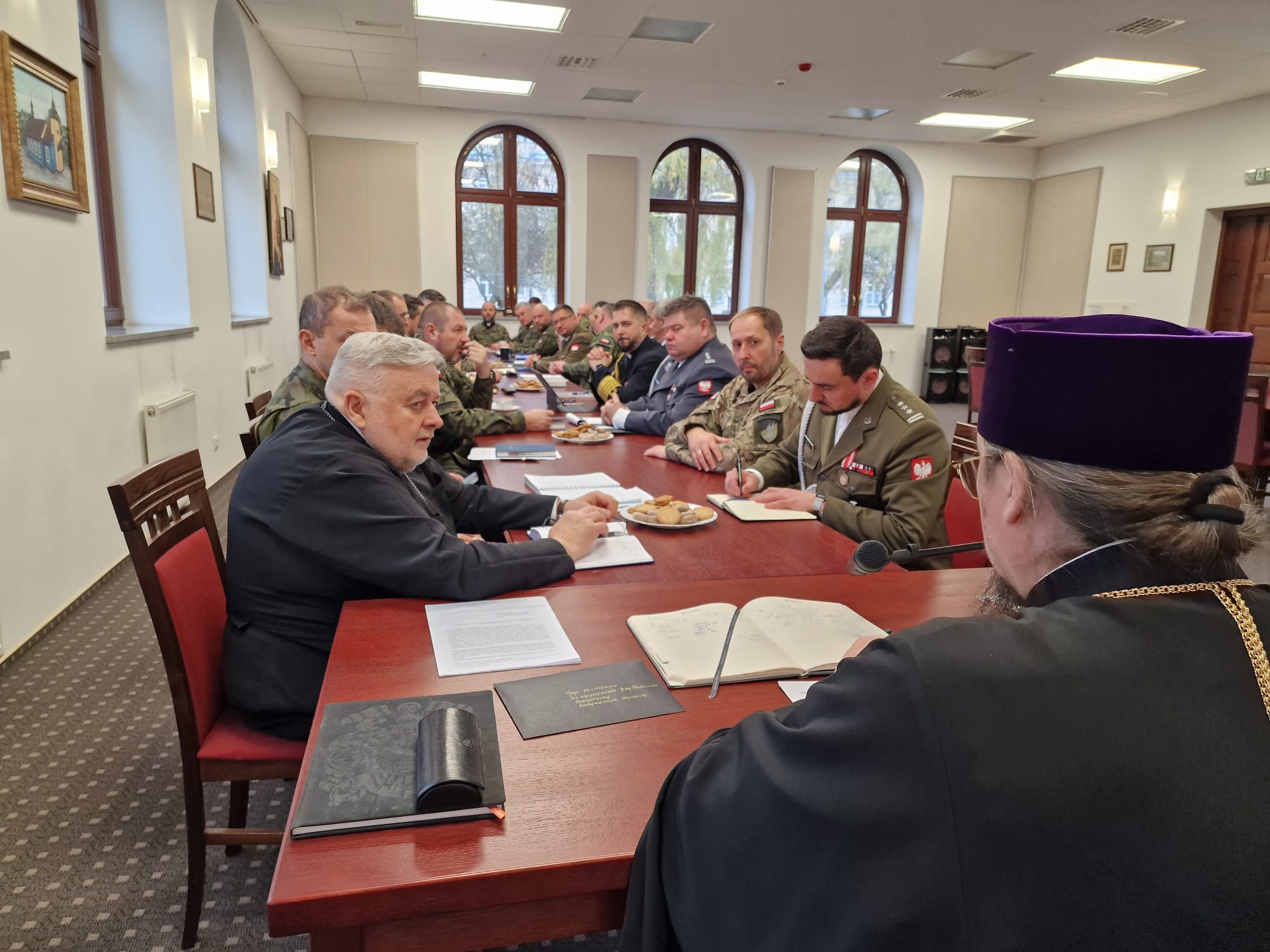 Kolejna część odprawy przeniesiona została do sali konferencyjnej POWP, gdzie Prawosławny Ordynariusz Wojskowy swoim wystąpieniem rozpoczął obrady. Odnosząc się do konkretnych przypadków podziękował kapelanom oraz pracownikom za codzienną służbę dla Ojczyzny i Cerkwi w Wojsku Polskim oraz Służbach Mundurowych. Ekscelencja zwrócił uwagę na szereg kwestii związanych z duszpasterską odpowiedzialnością, wyzwaniami współczesnego kapłana oraz organizacją przedsięwzięć ordynariatu w 2026 roku.