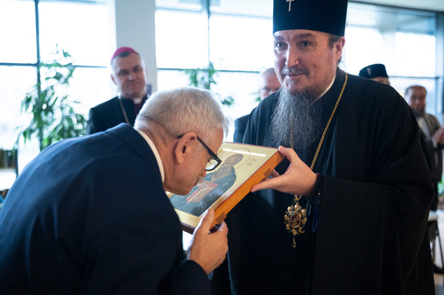 Uczestnicy Spotkania wysłuchali kolęd w wykonaniu chóru Chrześcijańskiej Akademii Teologicznej w Warszawie pod dyrekcją prof. Włodzimierza Wołosiukai oraz przy akompaniamencie dra Włodzimierza Lebieckiego. W tym wyjątkowym dniu JM Rektor abp prof. Jerzy Pańkowski wręczył prof. Włodzimierzowi Wołosiukowi ikonę św. Jana Teologa jako wyraz uznania za wieloletnią pracę na rzecz Akademii i każdorazowe upiększenie uroczystości akademickich.