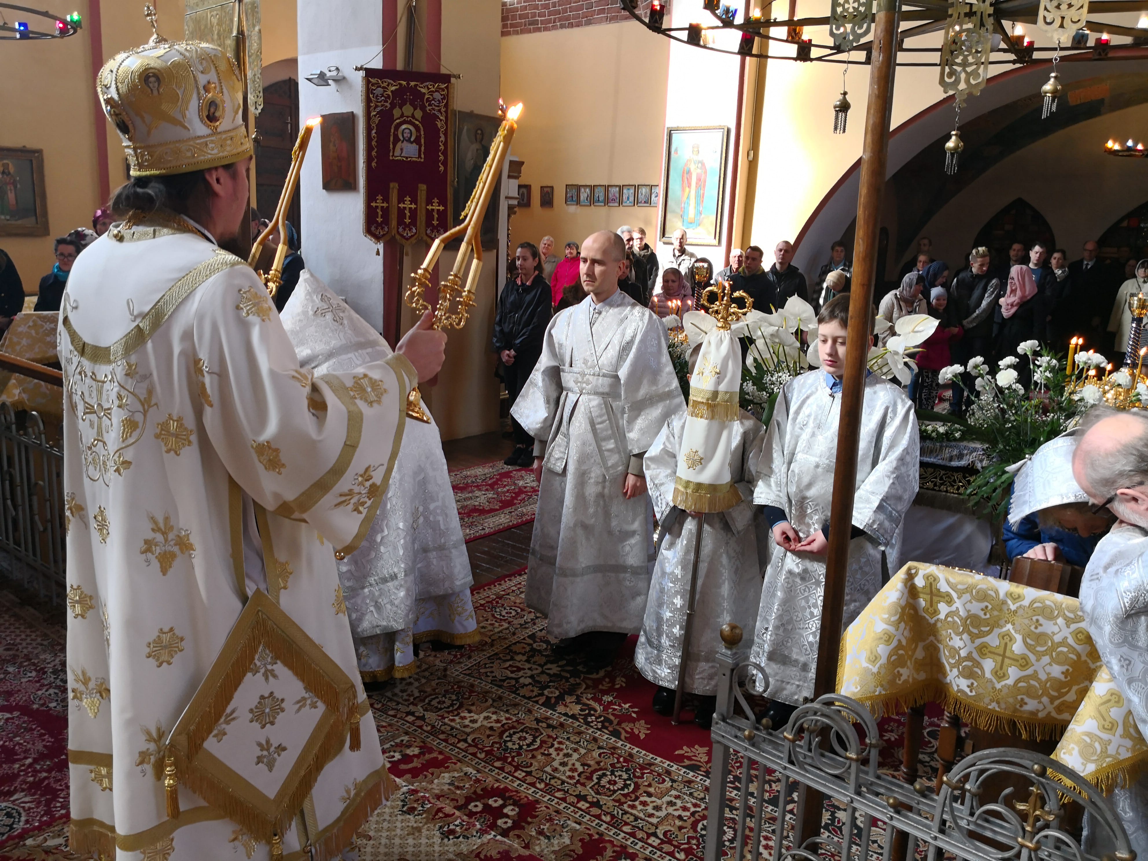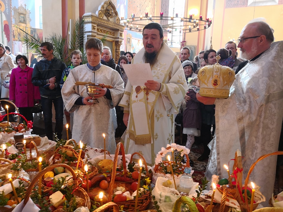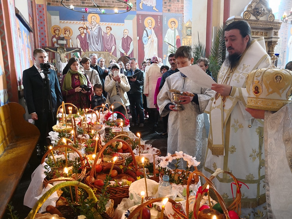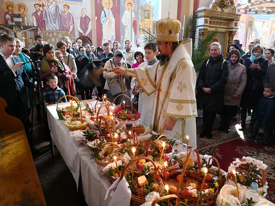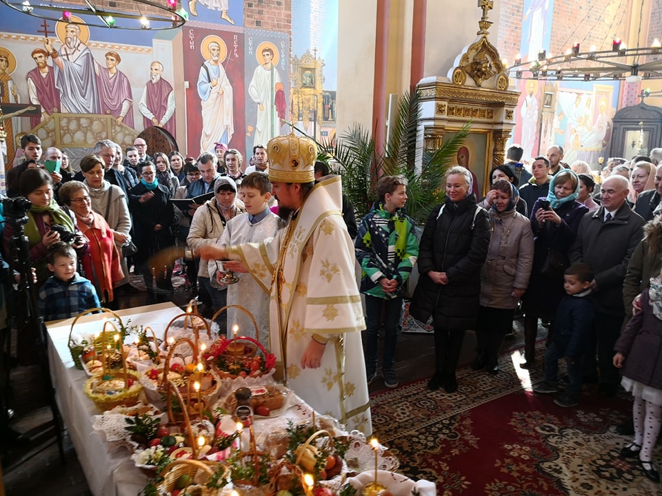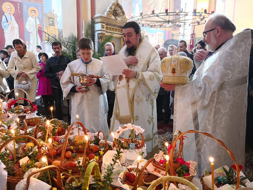 Po św. Liturgii Władyka Jerzy pobłogosławił chleby i wino, a następnie poświęcił przyniesione przez wiernych pokarmy paschalne.