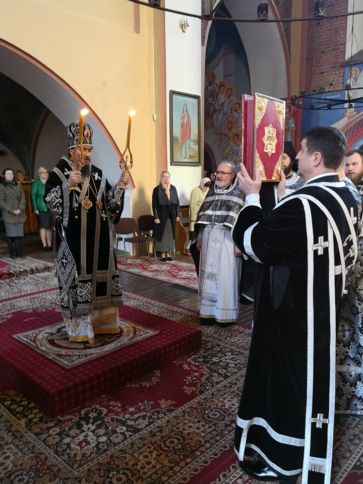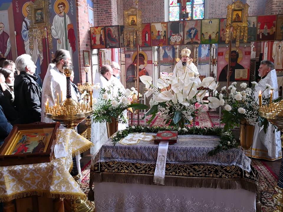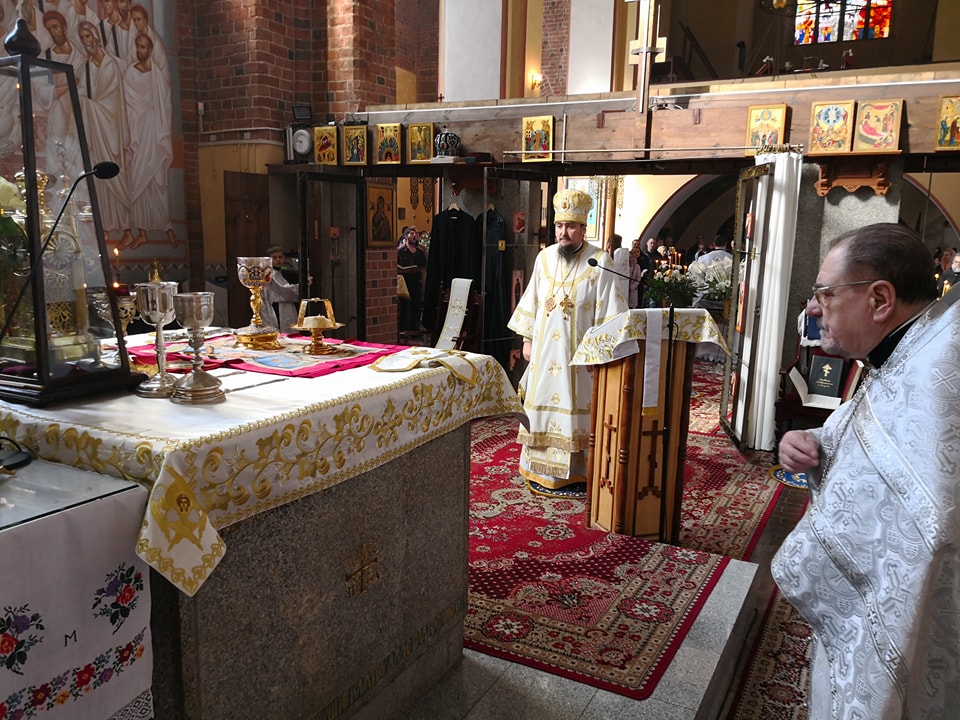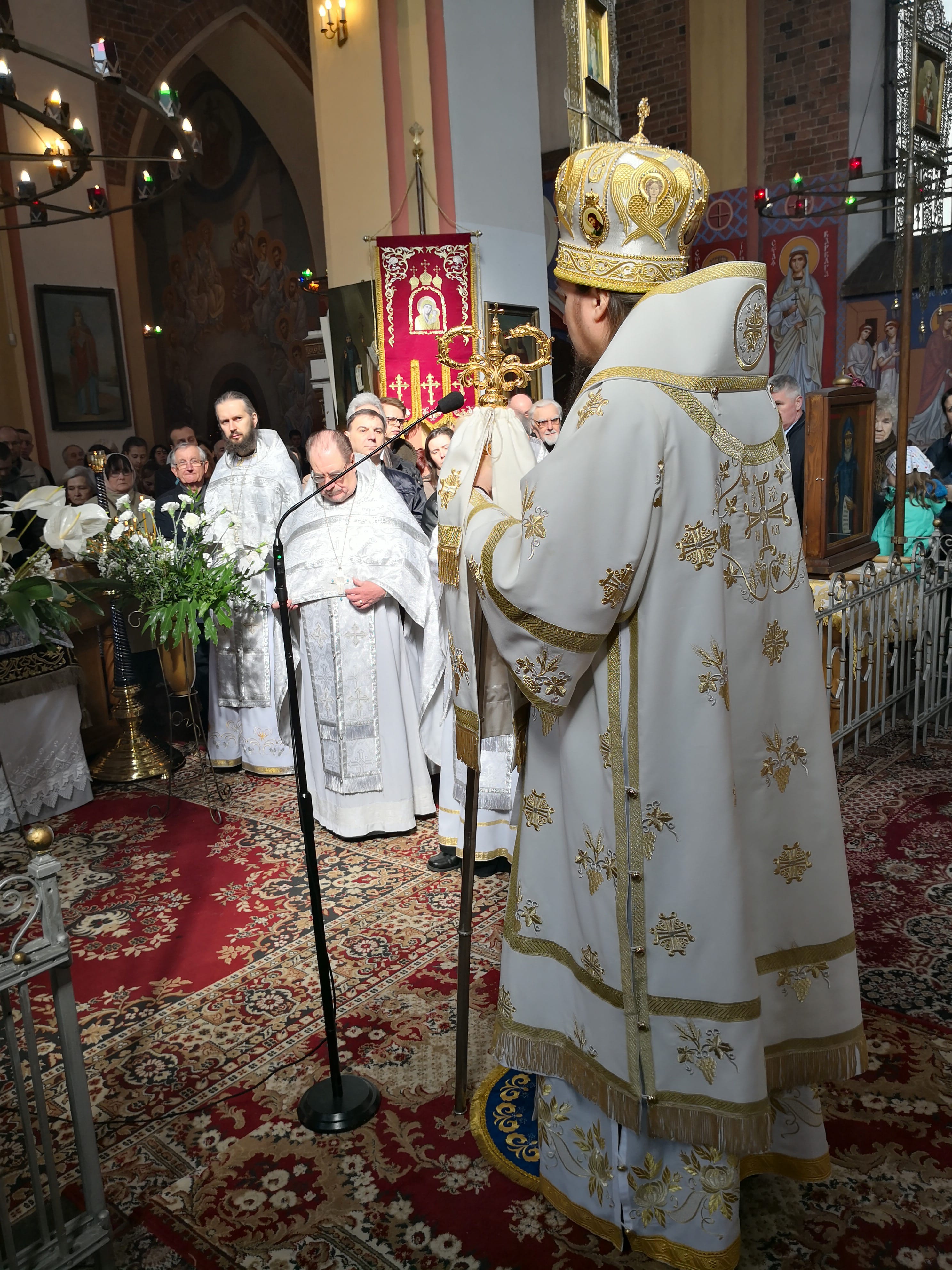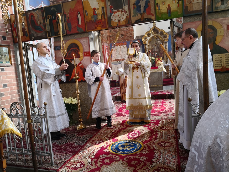 Po św. Liturgii Władyka Jerzy pobłogosławił chleby i wino, a następnie poświęcił przyniesione przez wiernych pokarmy paschalne.