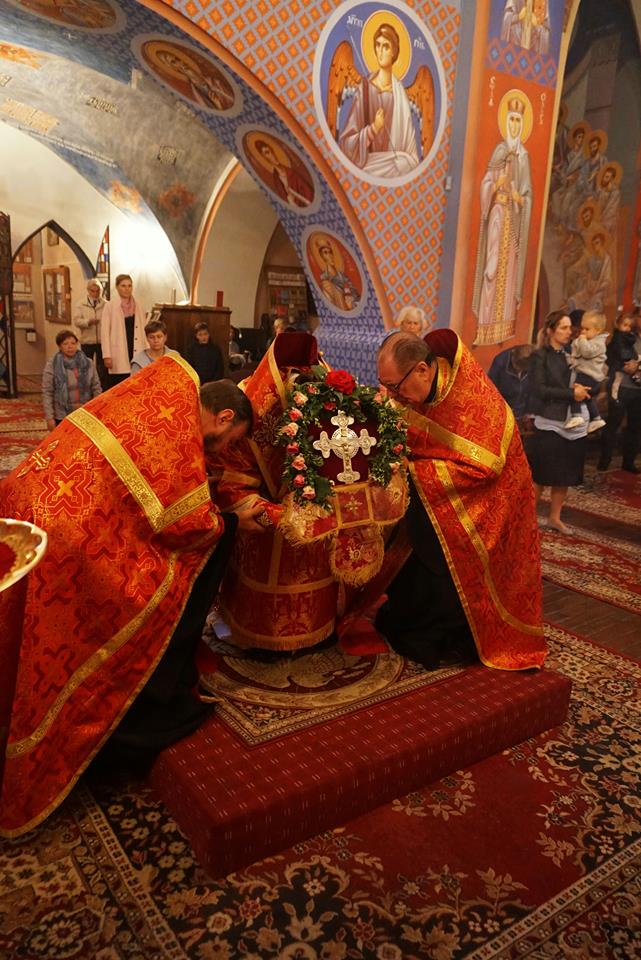 Tego dnia w katedrach biskupich dokonywany jest specjalny obrzęd Podwyższenia Krzyża, sprawowany przez arcypasterza. Podczas Wielkiej Doksologii, przewodniczący nabożeństwu biskup w towarzystwie diakona dokonuje trzykrotnego okadzenia ołtarza, na którym leży Święty Krzyż. Następnie, po trzech pokłonach, klęcząc, biskup podnosi Krzyż umieszczając go nad głową. Chór w tym czasie wykonuje pieśń Święty Boże. Niosącego Krzyż biskupa poprzedza okadzający świętość diakon oraz prysłużnicy z zapalonymi świecami.