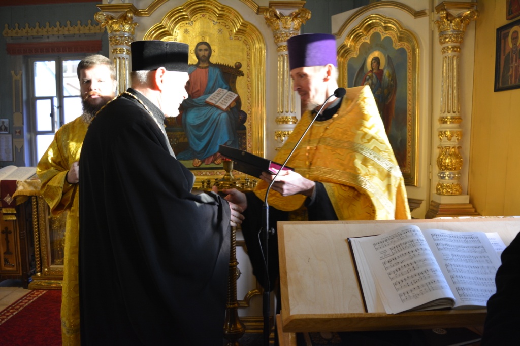 W świątyni powitał wszystkich nowy proboszcz ciechociński ks.prot. mjr Mirosław Kuczyński i zaprosił do wspólnej modlitwy. W geście wielkiego uznania za wieloletnią pracę na rzecz parafii, wręczył on swojemu poprzednikowi ks. mitratowi płk. rez. Mikołajowi Hajduczeni pamiątkowy krzyż kapłański.