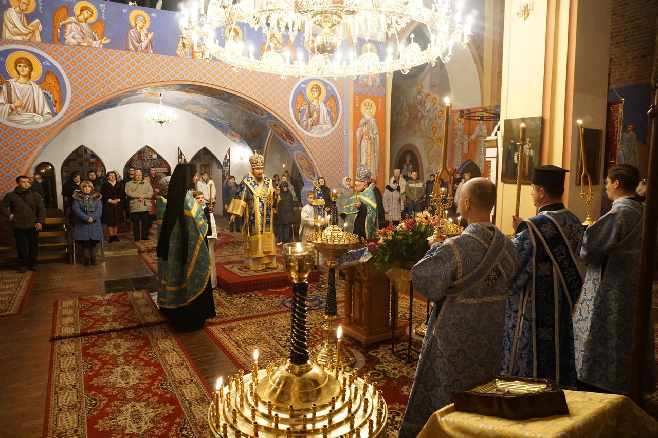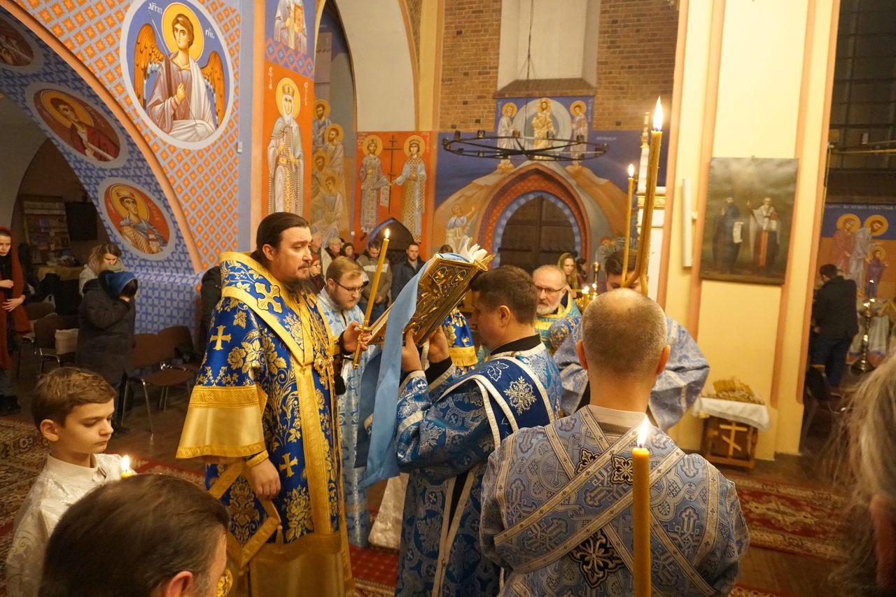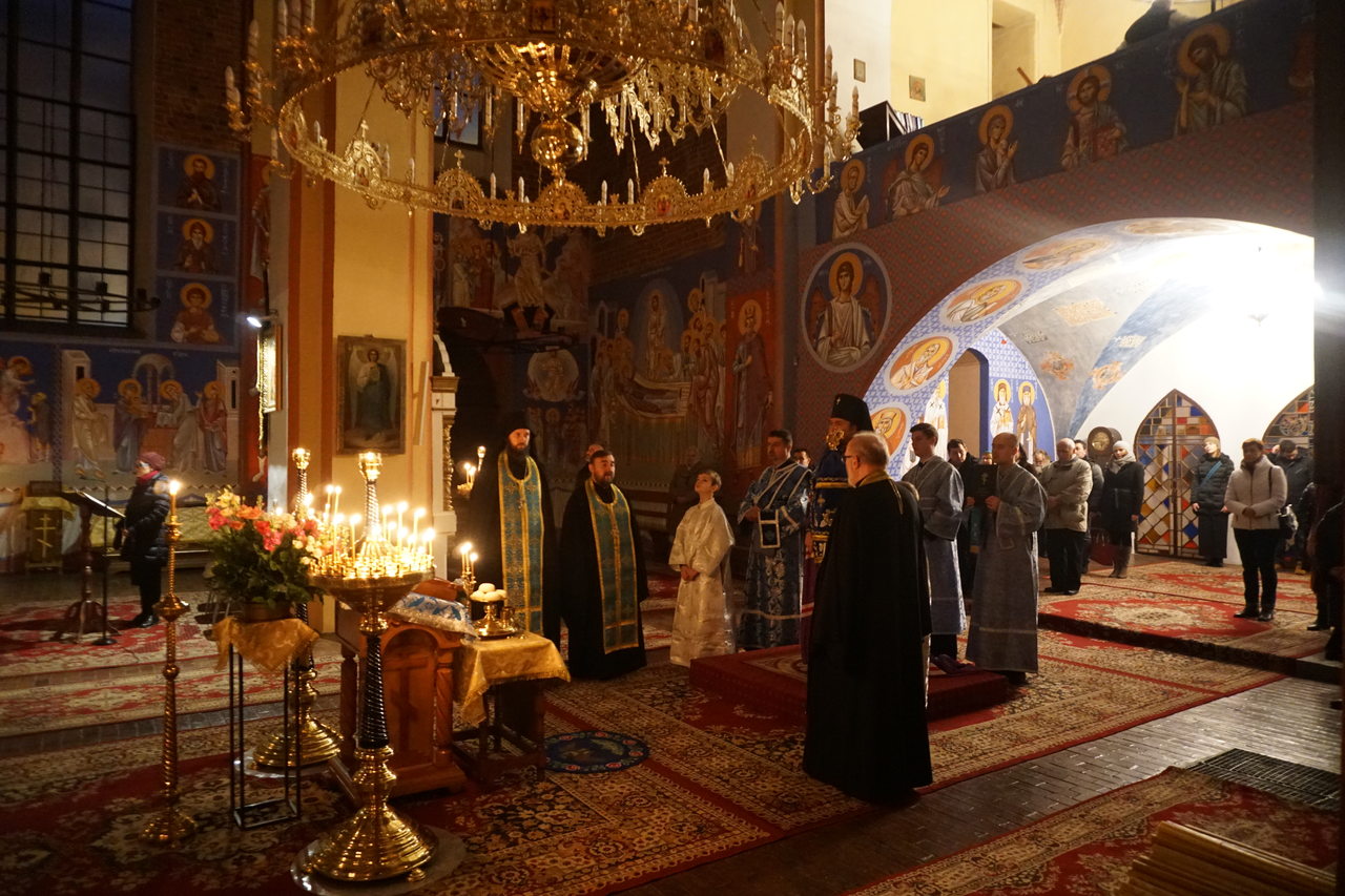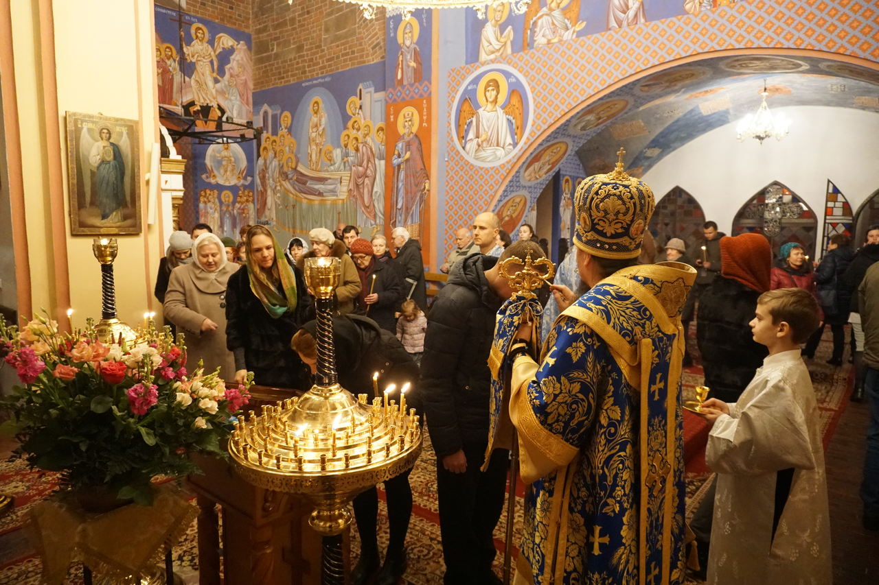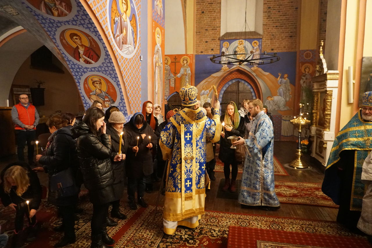 Podczas polieleju zabrzmiał fragment Ewangelii według św. Łukasza opisujący wydarzenie obchodzone w kalendarzu liturgicznym jako święto Spotkania Pańskiego: „A żył w Jerozolimie człowiek, imieniem Symeon. Był to człowiek prawy i pobożny, wyczekiwał pociechy Izraela, a Duch Święty spoczywał na nim. Jemu Duch Święty objawił, że nie ujrzy śmierci, aż zobaczy Mesjasza Pańskiego. Za natchnieniem więc Ducha przyszedł do świątyni. A gdy Rodzice wnosili Dzieciątko Jezus, aby postąpić z Nim według zwyczaju Prawa, on wziął Je w objęcia, błogosławił Boga i mówił: Teraz, o Władco, pozwól odejść słudze Twemu w pokoju, według Twojego słowa. Bo moje oczy ujrzały Twoje zbawienie, któreś przygotował wobec wszystkich narodów: światło na oświecenie pogan i chwałę ludu Twego, Izraela” (Łk 2,25-32).