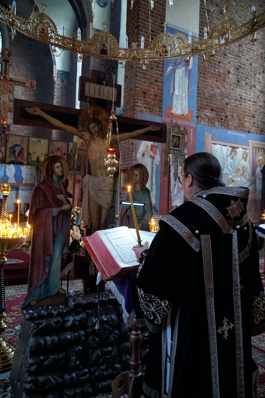 W wielkoczwartkowy wieczór, Jego Ekscelencja abp Jerzy przewodniczył nabożeństwu jutrzni z czytaniem 12 fragmentów Ewangelii opowiadających o ostatnich godzinach życia Chrystusa. To wyjątkowe nabożeństwo rozpoczyna Triduum Paschalne Cerkwi Prawosławnej. Jutrznia Wielkiego Piątku, sprawowana zwyczajowo wieczorem poprzedzającego dnia, jest wprowadzeniem w przeżywanie dramatycznych wydarzeń Wielkiego Piątku. Czytane fragmenty Ewangelii mówią o ostatniej wieczerzy, pojmaniu Jezusa w ogrodzie Getsemani, procesie przed żydowskim Sanhedrynem i Piłatem oraz Śmierci na Krzyżu. Ostatnia z czytanych Ewangelii mówi o złożeniu ciała Mesjasza do grobu i zapieczętowaniu go przez strażników.