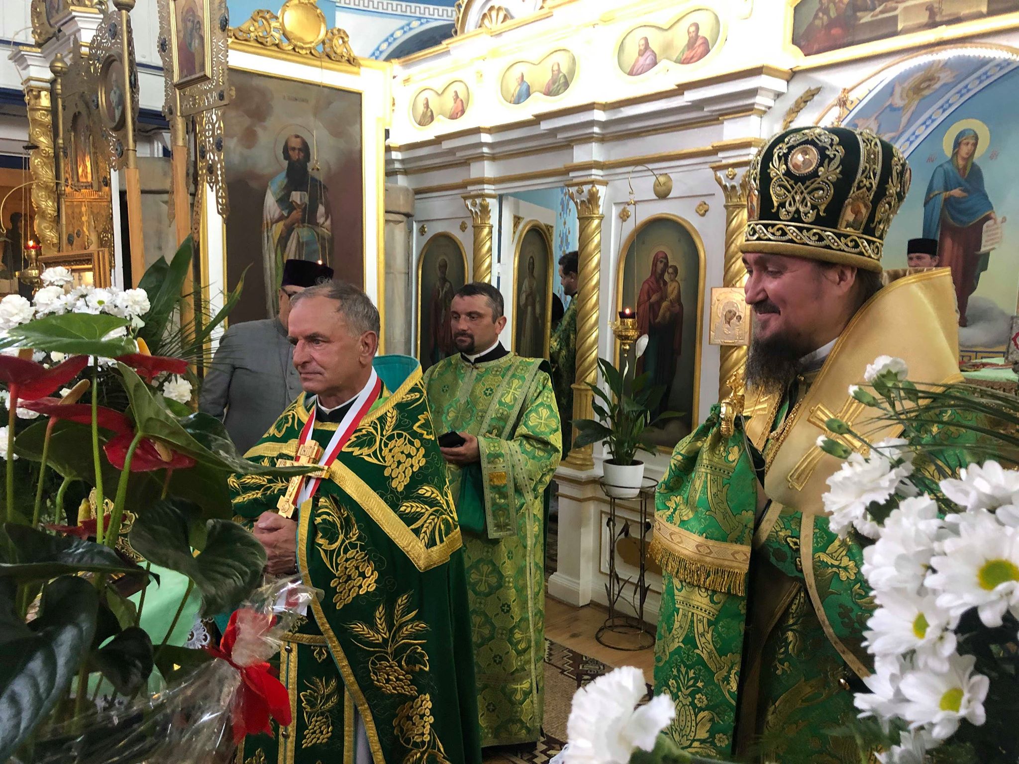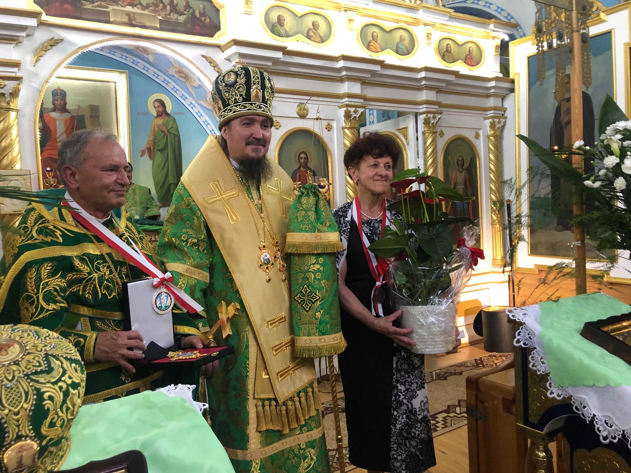 Świąteczna doksologia Bogu-Duchowi Św. zbliżyła obecnych do zakończenia św. Liturgii, po której arcybiskup Jerzy przywołał głębokie słowa i myśli Ojców Cerkwi o istocie służby kapłańskiej i wynikającej z niej odpowiedzialności kapłana na wieczność. Zwieńczeniem podniosłej atmosfery było nagrodzenie Jubilata i Jego małżonki - matuszki Heleny, stosownymi orderami św. Marii Magdaleny, przyznanych przez św. Sobór Biskupów PAKP. Podziękowania dla parafian, rodziny, przyjaciół połączyły się z życzeniami przybyłych na święto: przedstawicielami miejscowych władz, wielu szczebli i formacji, wyrażających w słowach i upominkach, swój szacunek i życzliwość dla Jubilata.