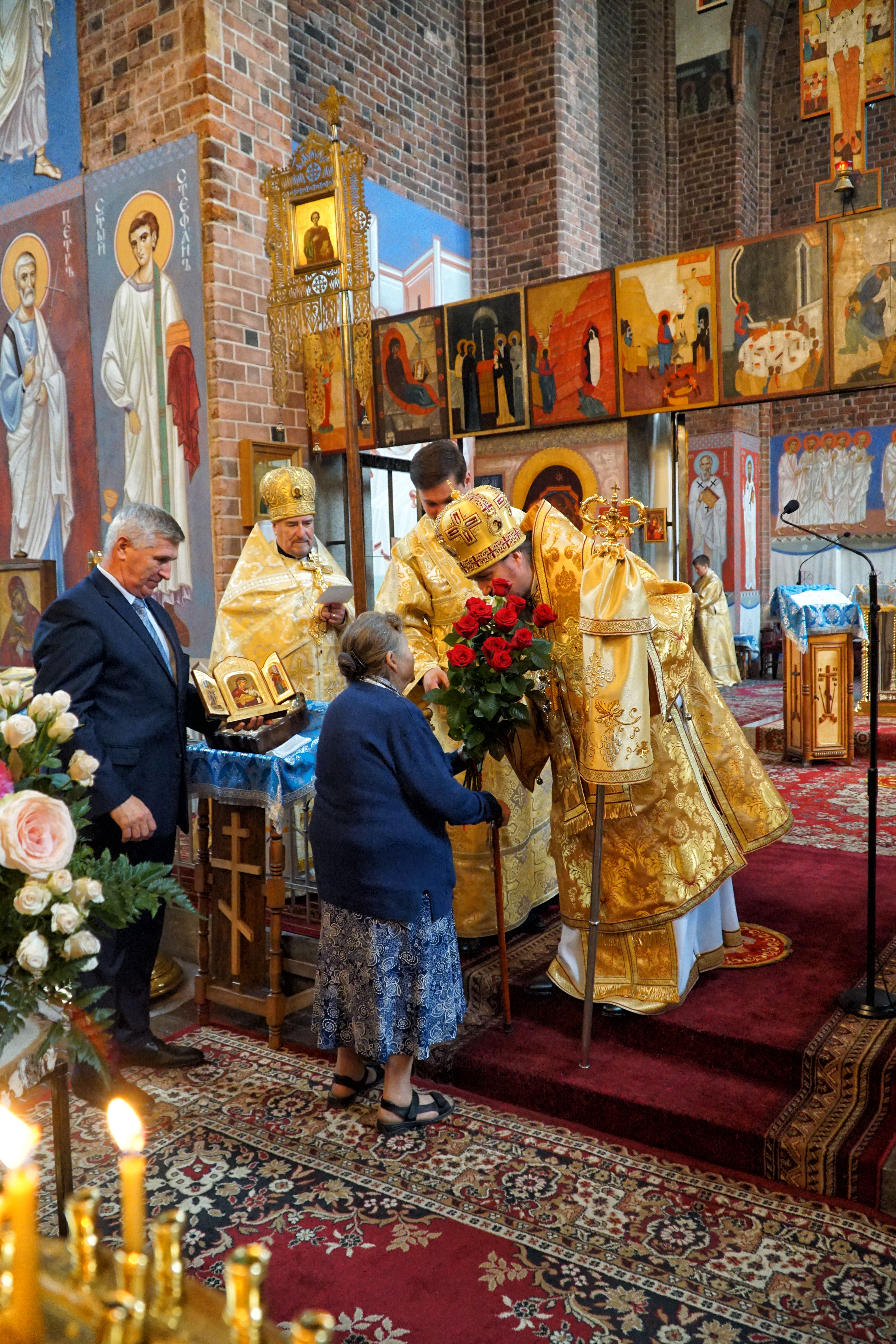 Po zakończeniu nabożeństwa Władyka zwrócił się do obchodzącej swoje 90 urodziny pani Anny Kardasz, życząc jej wielu Łask Bożych oraz zdrowia. Jego Ekscelencja wręczył solenizantce kwiaty oraz ikonę Bogurodzicy życząc, aby zawsze znajdowała w modlitwie pocieszenie i pokrzepienie sił duchowych jak i fizycznych. Na koniec zabrzmiało gromkie mnohaja leta dla pani Anny.