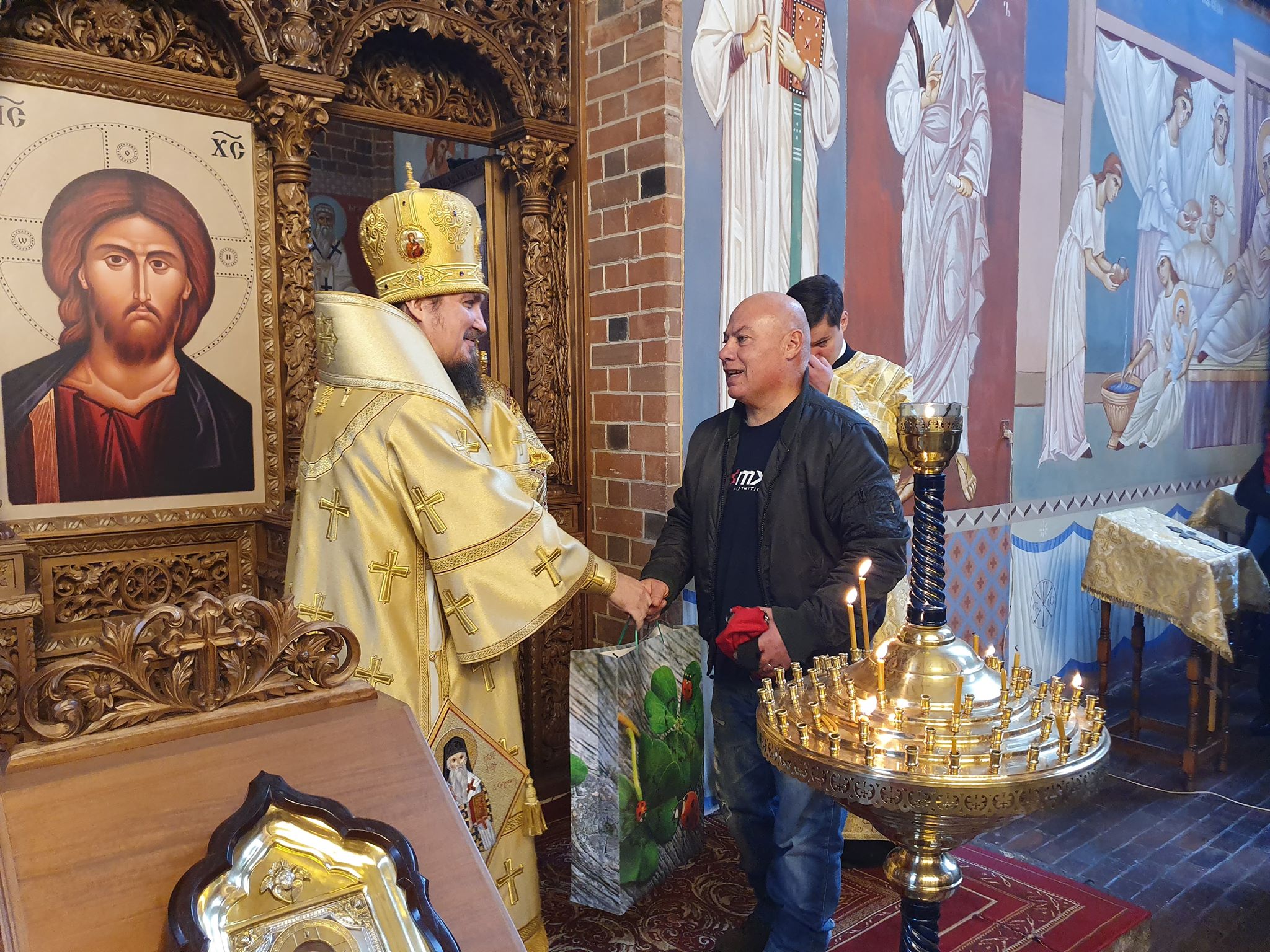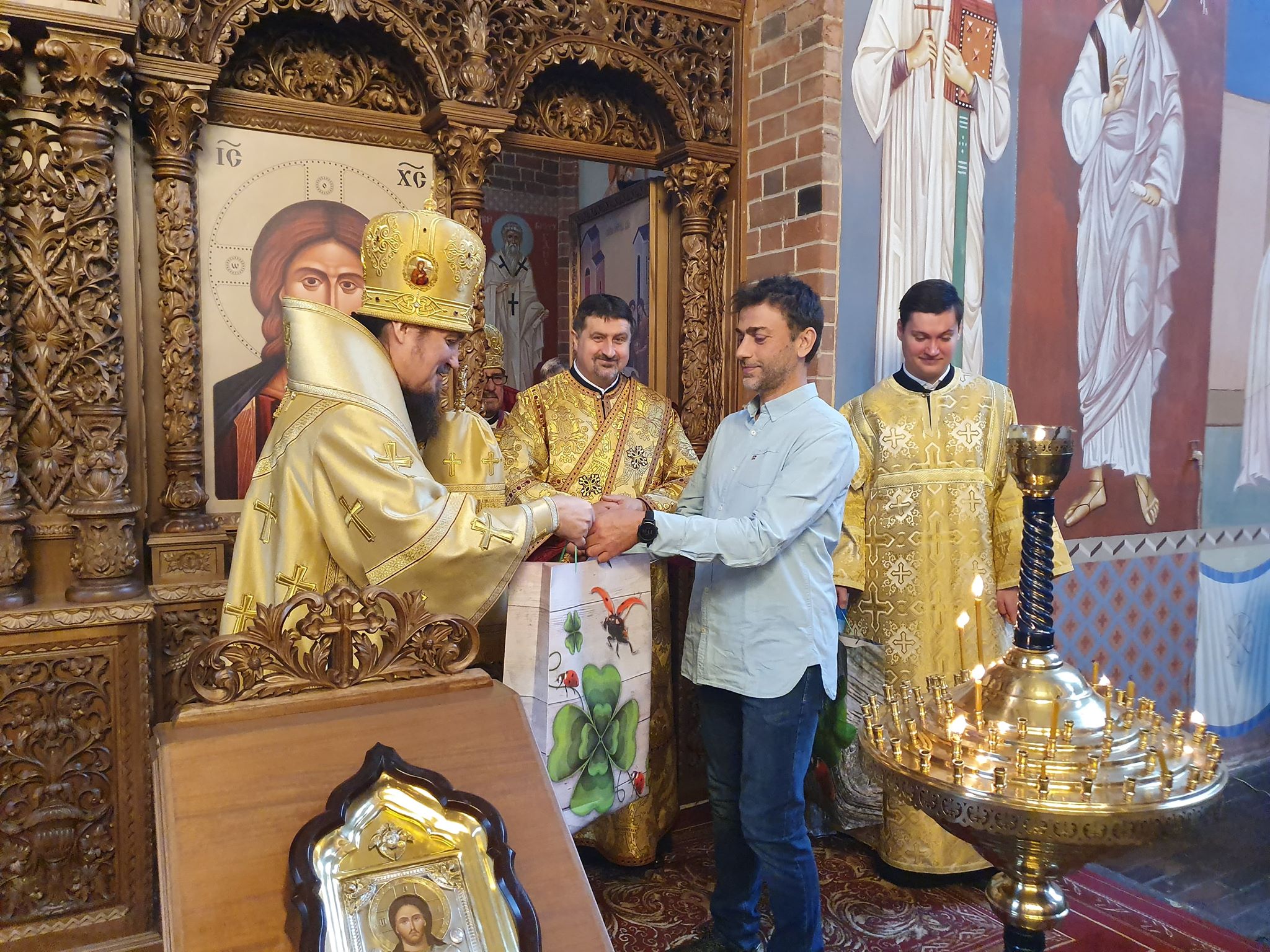 Następnie Jego Ekscelencja zwrócił się do obecnych podczas Liturgii mistrzów rzeźbiarstwa, autorów ikonostasu panów Eugenisa i Nikosa, którzy nie tylko wykonali, ale również przywieźli i zamontowali ikonostas. Władyka wyraził serdeczne podziękowania od siebie oraz całej wspólnoty wrocławskiej katedry za wielki trud i ciężką pracę, której owocem jest piękny i jedyny w swoim rodzaju ikonostas. Jego Ekscelencja wręczył twórcom podarunki oraz złożył życzenia z okazji zbliżających się świąt Narodzenia Chrystusa.