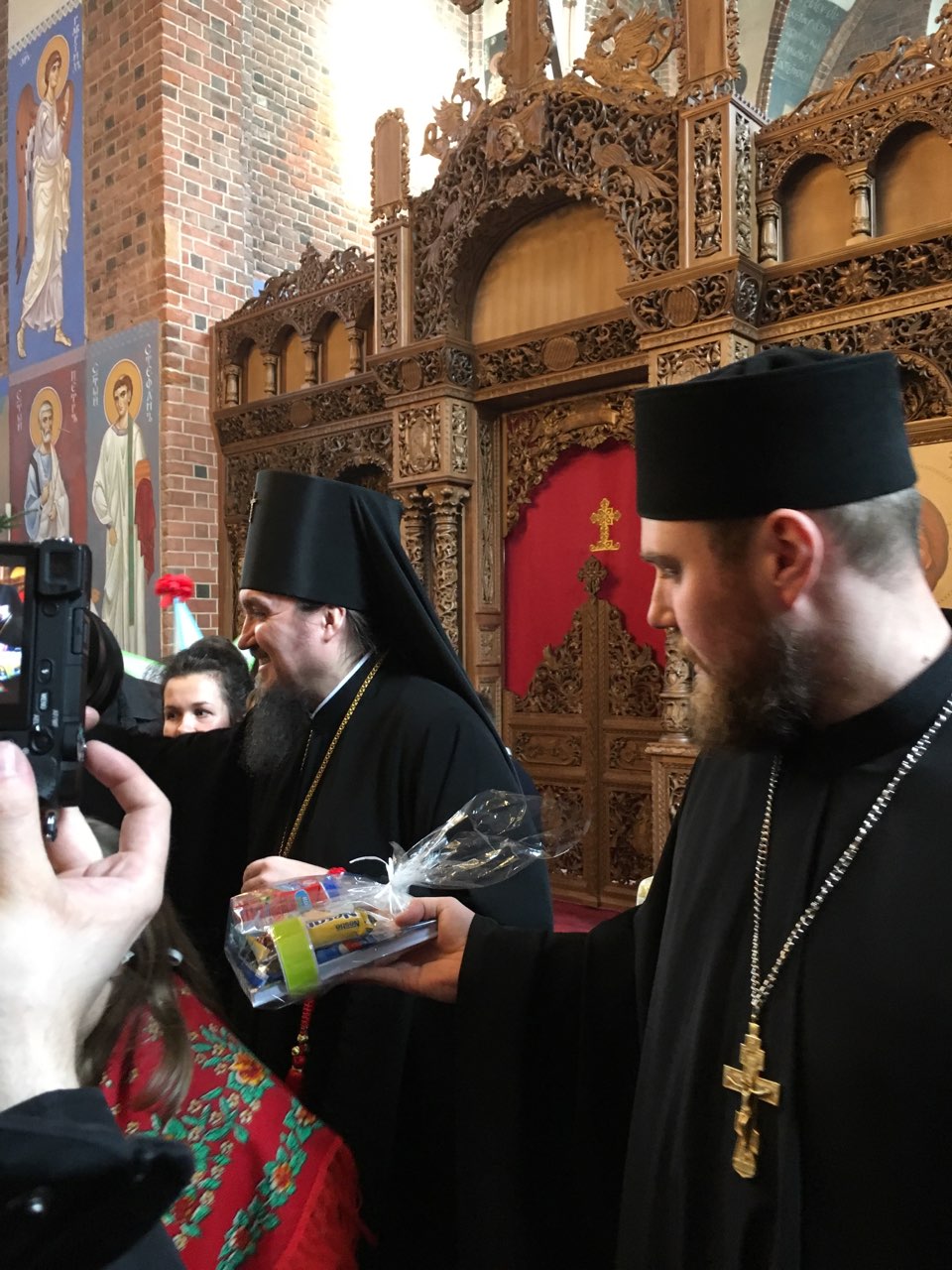 Po słowach podziękowania Władyka tradycyjnie rozdał wszystkim zebranym w świątyni dzieciom świąteczne paczki, w których oprócz słodkości znalazły się rzeczy praktyczne jak odblaski mające pomóc w bezpieczeństwie naszych dzieci, oraz element duchowy - ilustrowana Biblia dla najmłodszych.