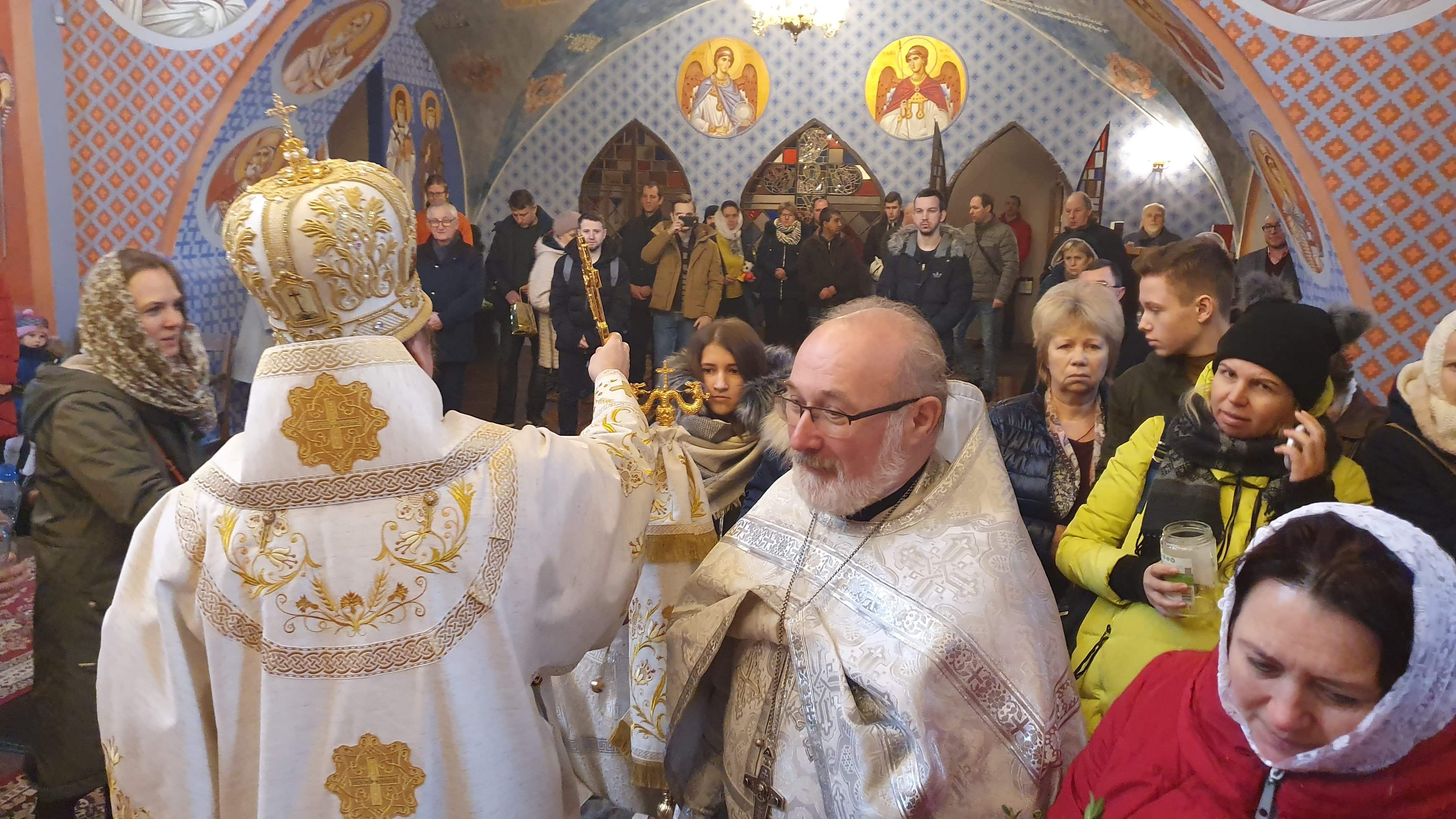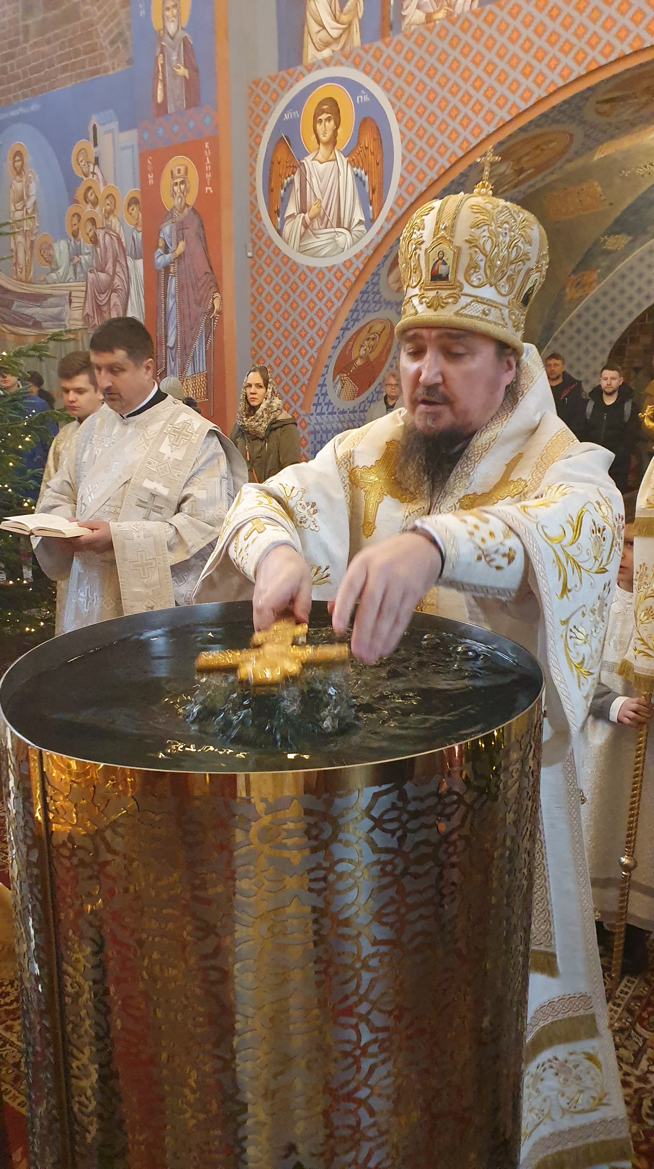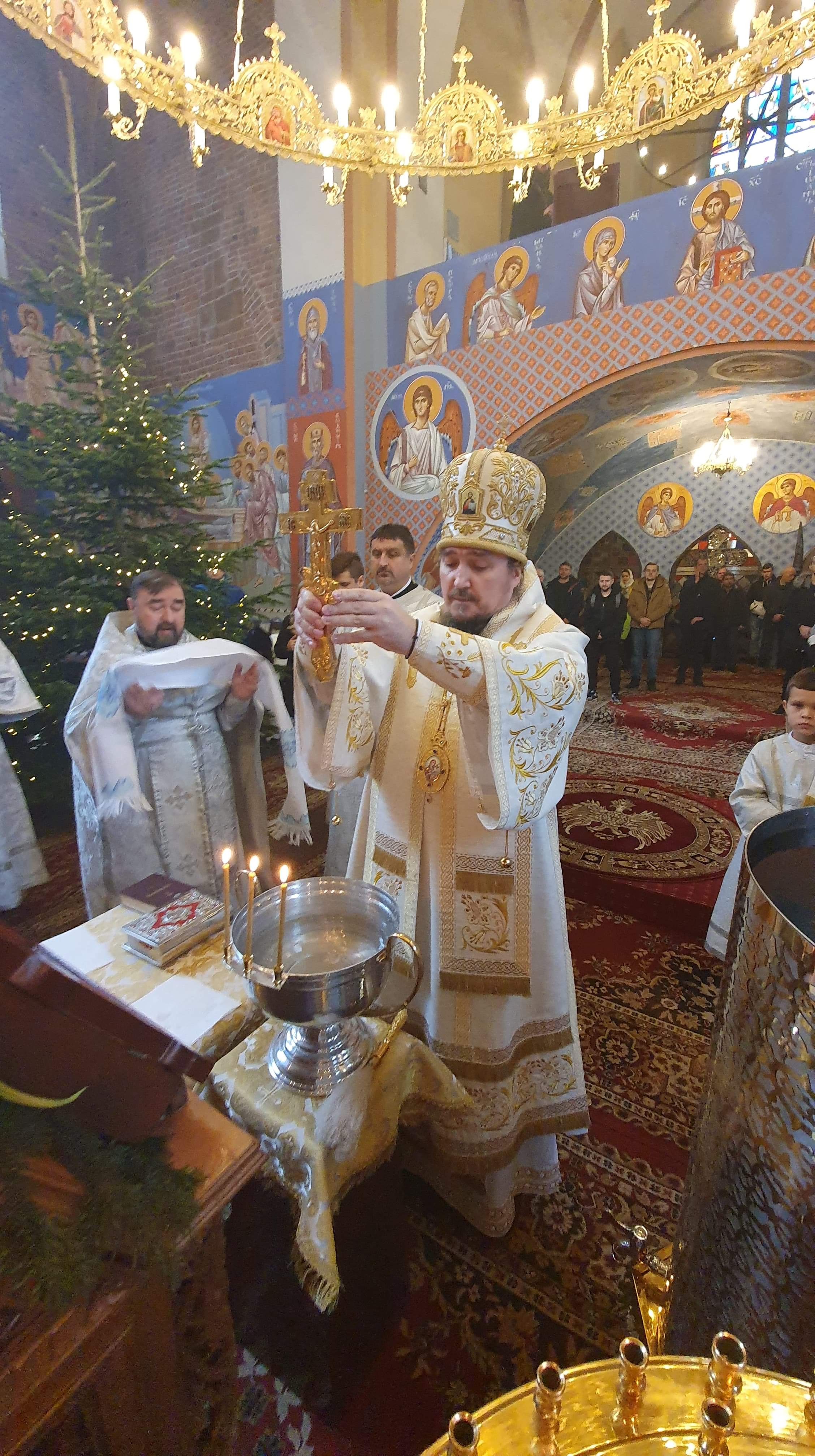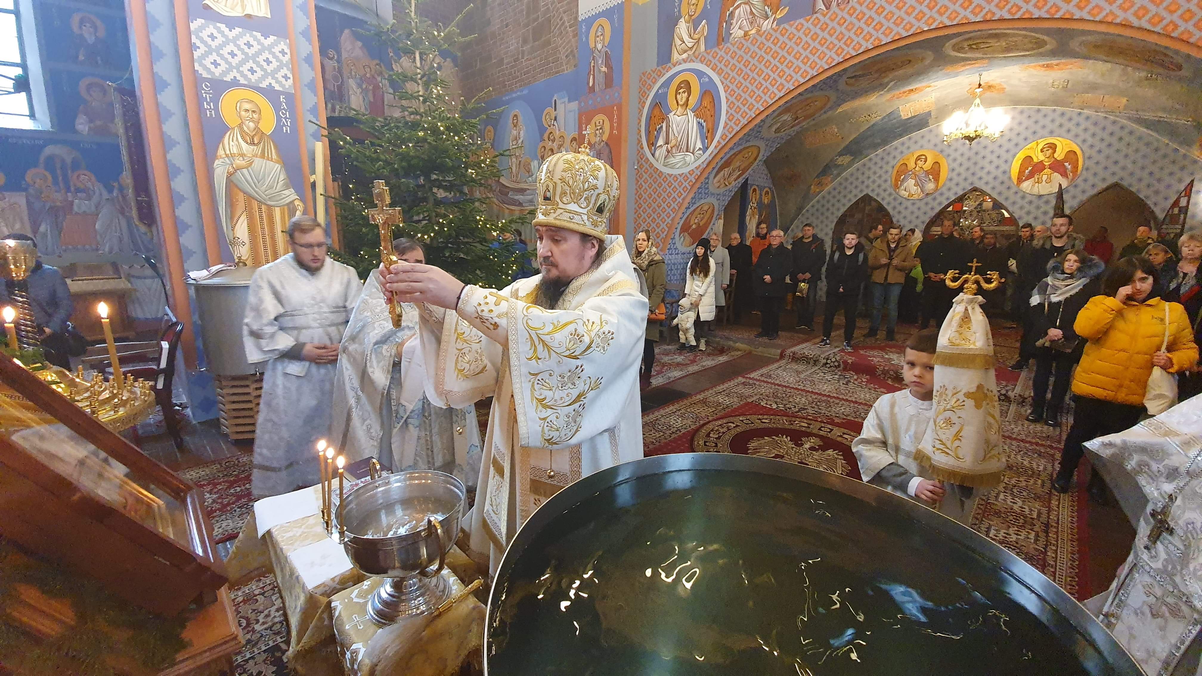 Po nabożeństwie Arcybiskup Jerzy zwrócił się do wiernych z homilią, w której zwrócił uwagę, że do IV wieku Boże Narodzenie i Chrzest Pański stanowiły jedno - święto Epifanii, cs. Bogojawlenija. Zwrócił również uwagę na charakterystykę chrztu Janowego. Podkreślił, że symbolika gołębia, pod postacią którego objawił się Święty Duch ma swoje głębokie biblijne znaczenie. Jest on symbolem nie tylko pokoju, ale również zbawienia, gdyż to właśnie gołębica wypuszczona z arki przez Noego powróciła ze świeżą gałązką, zwiastując tym samym koniec potopu. Arcybiskup zwrócił również uwagę na to, że chrzest dzieli ziemskie życie Chrystusa na „przed” i „po”. Przed chrztem Jezus był nikomu nie znaną osobą, jak mniemano synem cieśli, chrzest Janowy był zaś punktem zwrotnym i zarazem początkiem Mesjańskiej misji Syna Bożego. Władyka podkreślał, że chrzest był momentem, w którym Chrystus, będąc bezgrzesznym, dobrowolnie wziął na siebie brzemię ludzkiego upadku, gdyż właśnie w Jordanie ludzie obmywali się ze swoich grzechów, przychodząc do Jana Chrzciciela. Kończąc swoją homilię, Władyka zwrócił uwagę na wielką świętość wody uświęcanej w przeddzień oraz w dzień Chrztu Pańskiego i przypomniał z jaką czcią, szacunkiem i pobożnością należy z nią postępować.