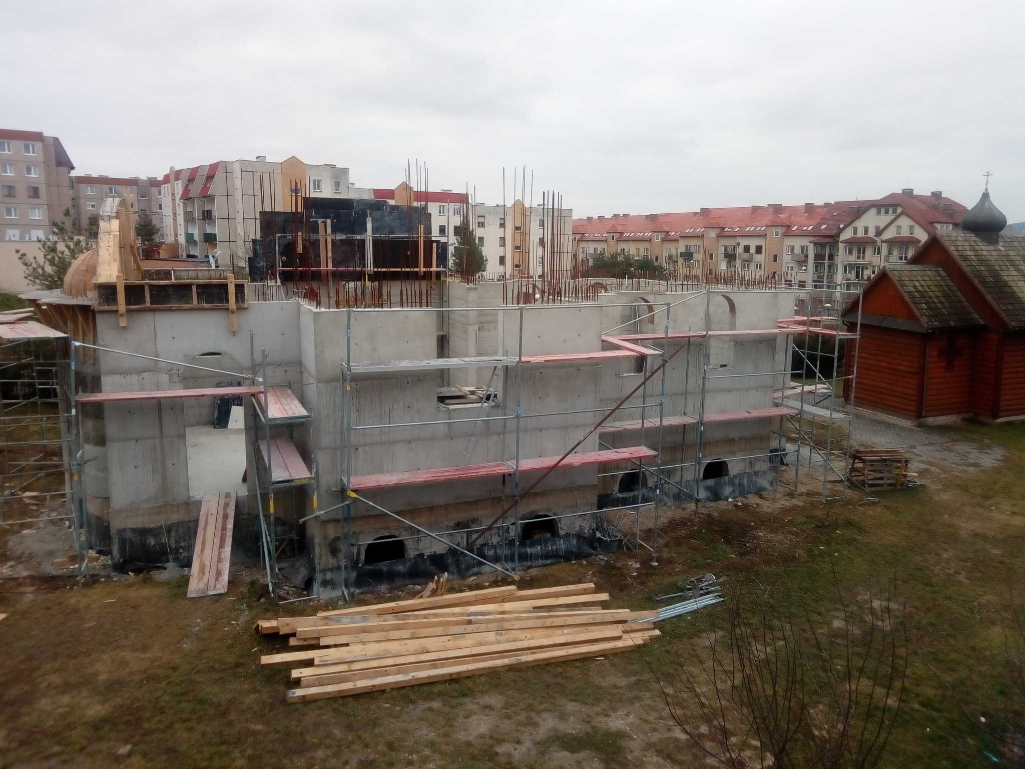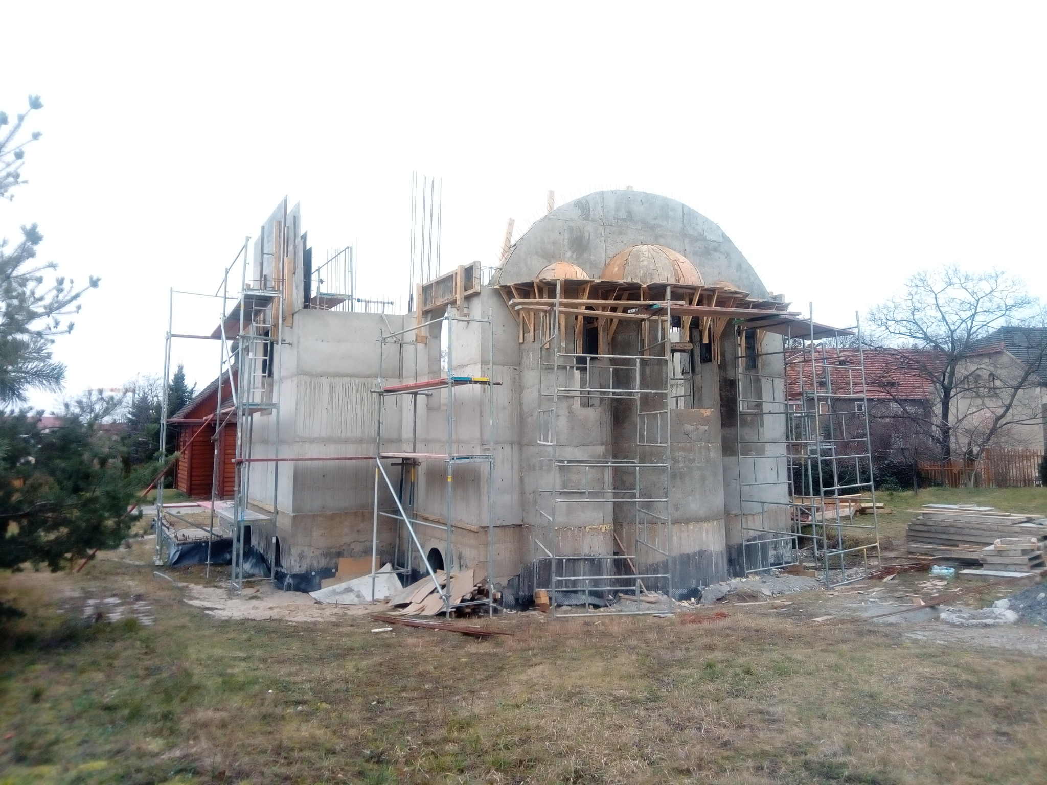 Z końcem grudnia ubiegłego roku zakończono wylewanie ścian nowo wznoszonej cerkwi. Szczególnie trudne było wykonanie elementów łukowych okien i drzwi oraz wymurowanie trzech absyd w części ołtarzowej. Zaraz po świętach Bożego Narodzenia robotnicy wylali łukowy szczyt ściany wschodniej i przystąpili do formowania odeskowania pod małe sklepienia absyd prezbiterium. Rozpoczęto też zbrojenie i szalowanie szczytu ściany południowej transeptu cerkwi.