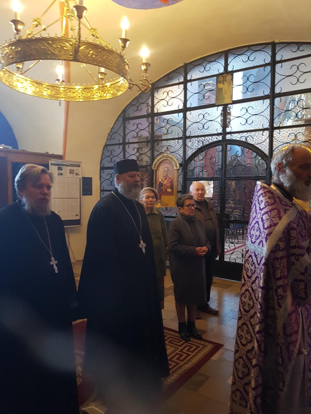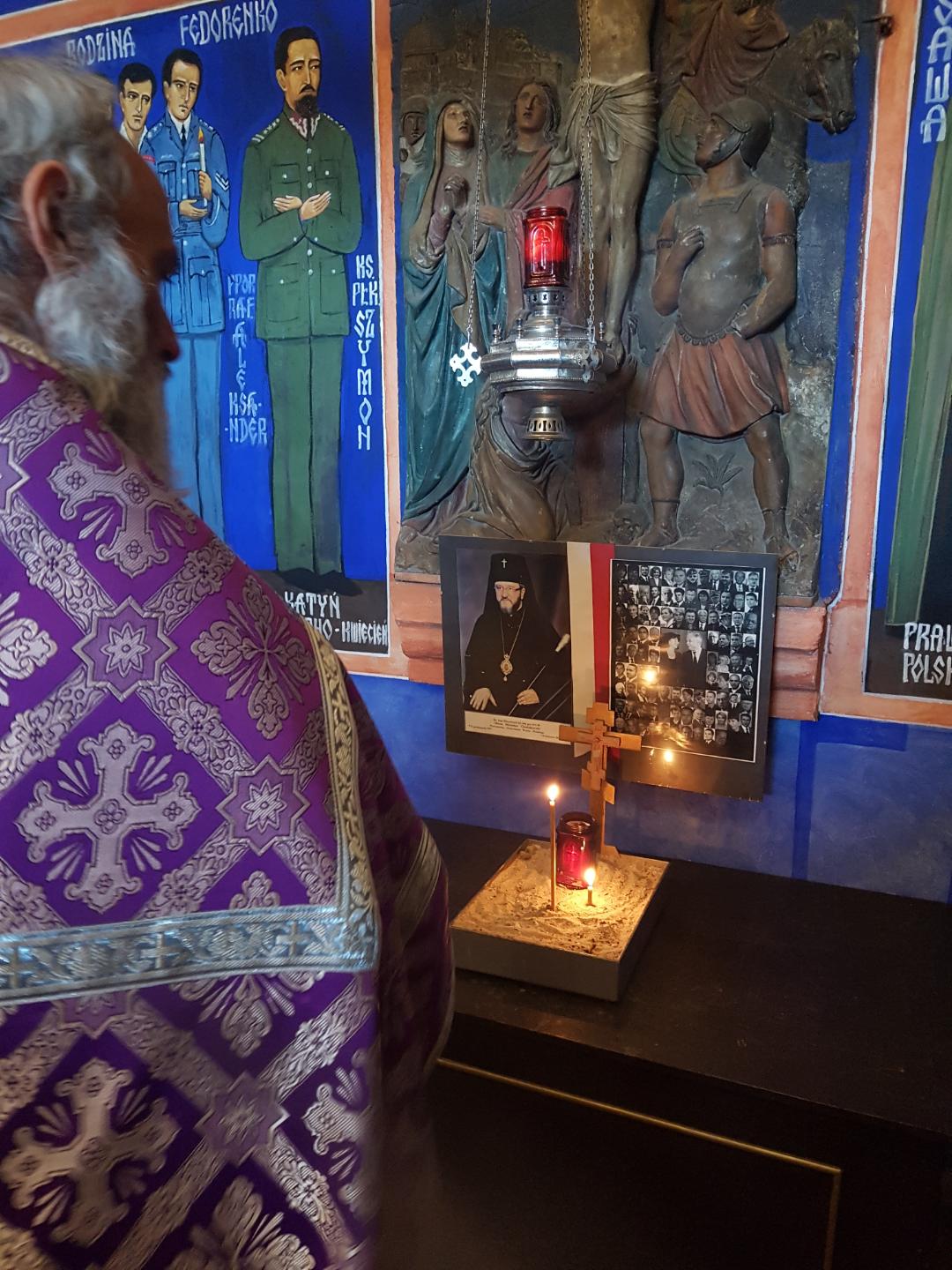 Nabożeństwo żałobne - Panichidy odprawione zostało w narteksie cerkwi gdzie znajduje się memorialny fresk poświęcony prawosławnym biskupom wojskowym lat 1939-2010, zamordowanemu w Katyniu ks. płk. Symeonowi Fedorońko oraz jego trzem synom, którzy zginęli śmiercią bohaterów w Powstaniu Warszawskim i lotniczej Bitwie o Anglię.