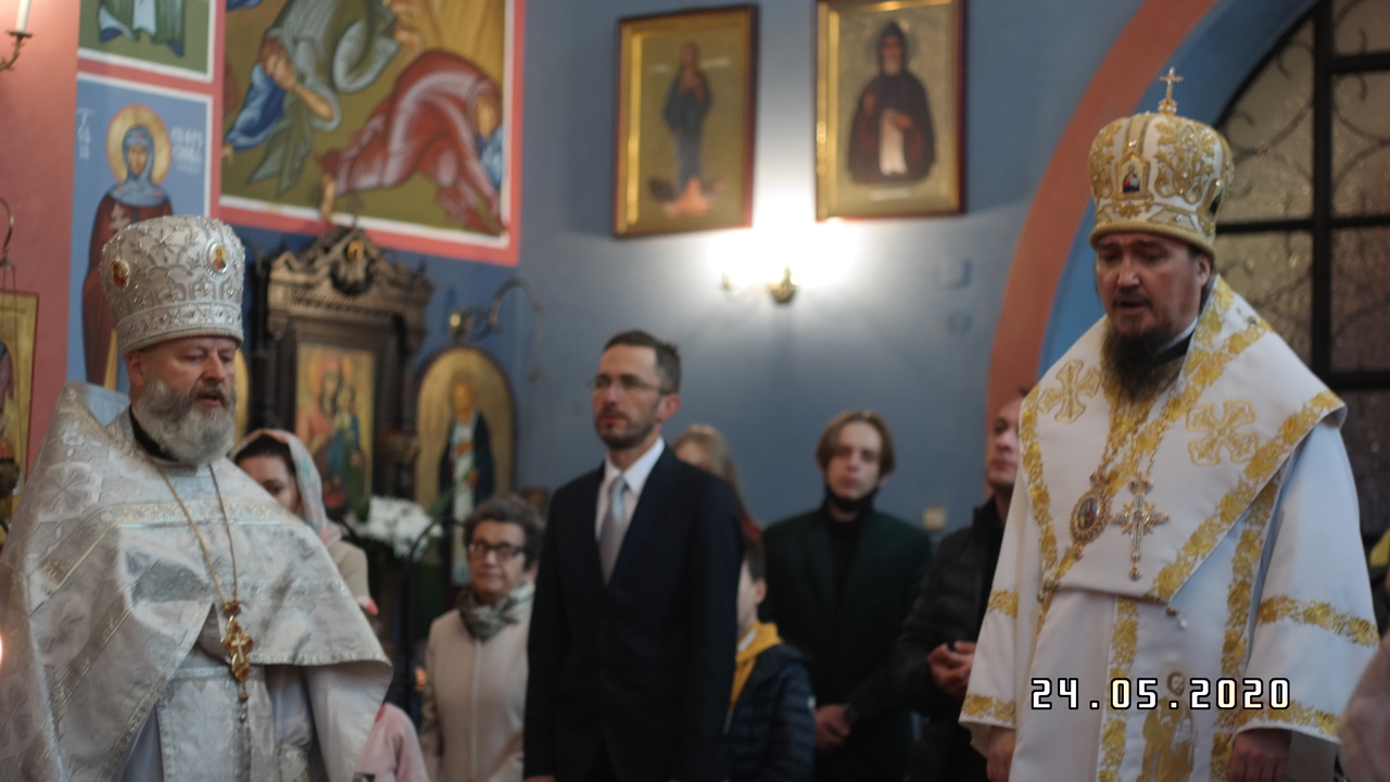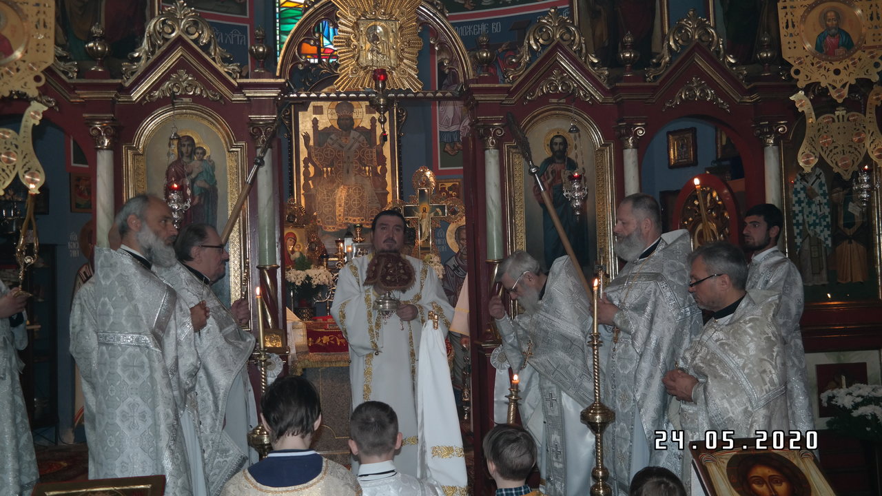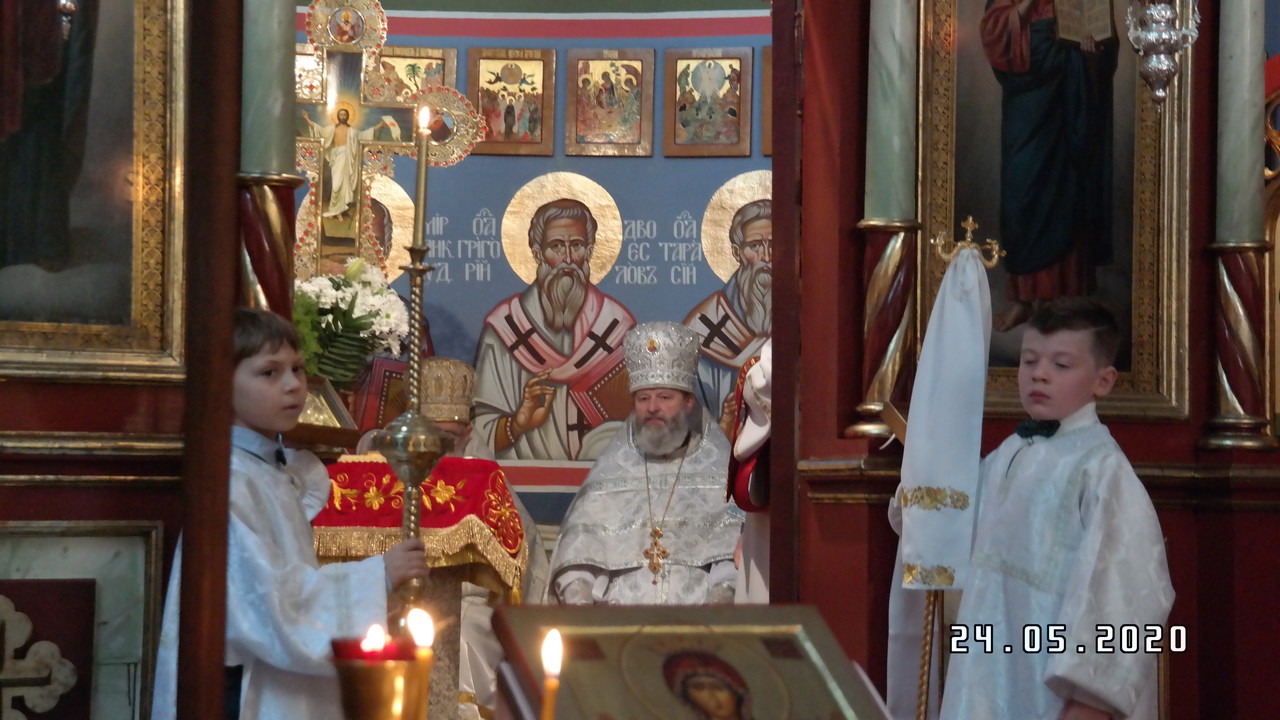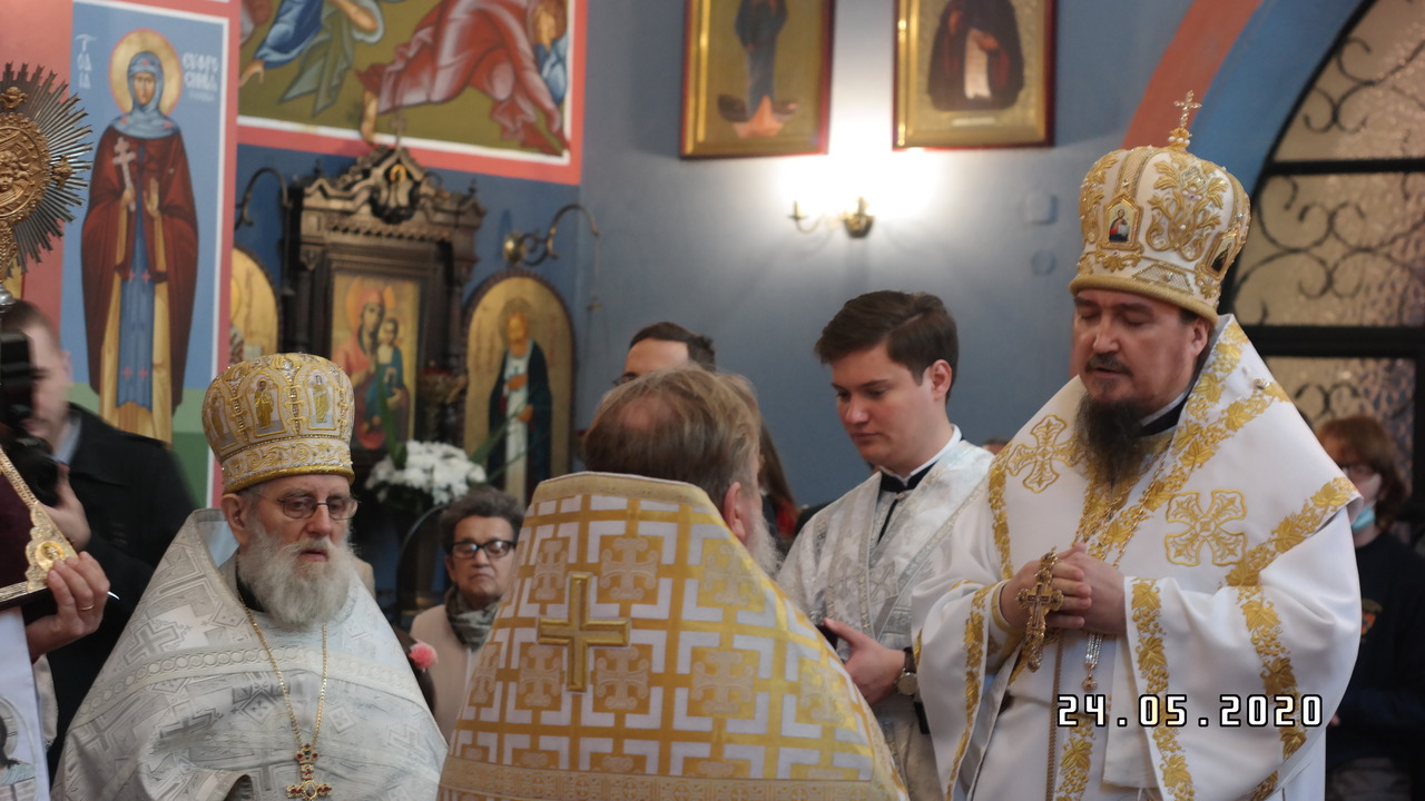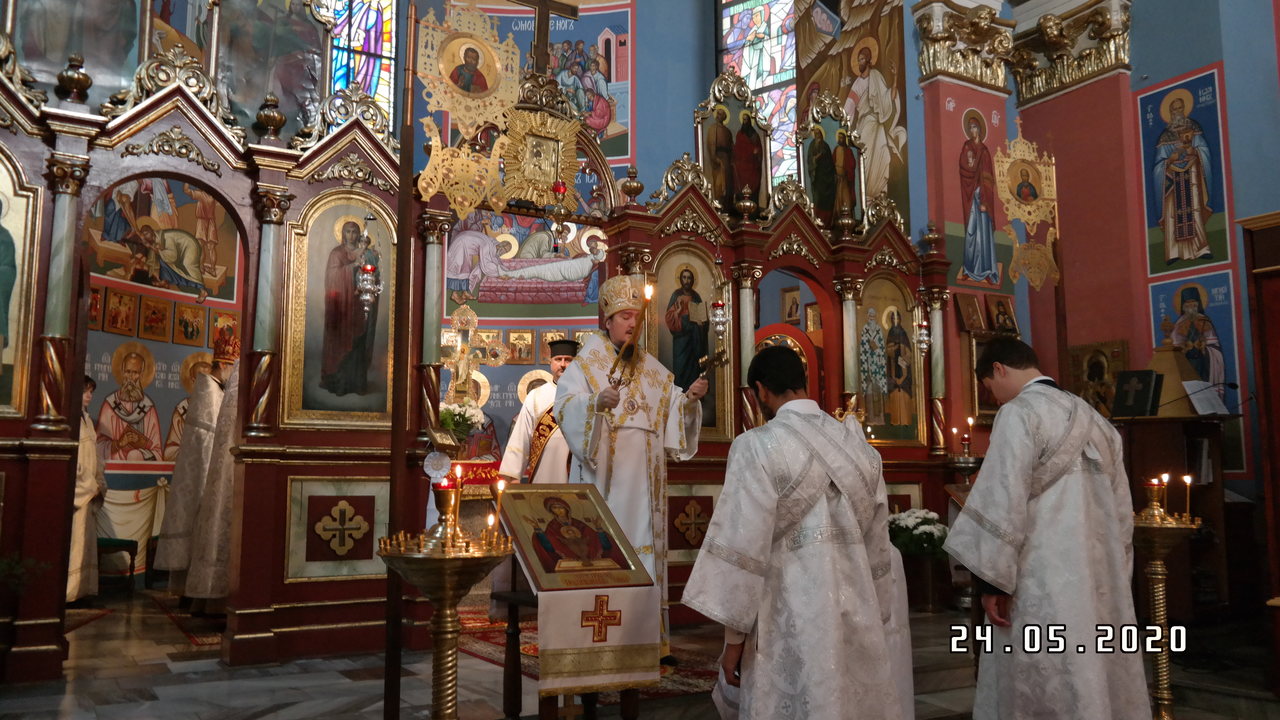 U wejścia do świątyni, licznie zgromadzone dzieci, wraz ze starostą parafii ppłk Edwardem Dziewońskim, powitali Arcypasterza, którego następnie proboszcz parafii ks. mitrat płk rez. dr Eugeniusz Bójko, poprosił o przewodniczenie świątecznej Liturgii dla zgromadzonych wiernych, jak i w intencji nieobecnych z powodu trwającej epidemii.
