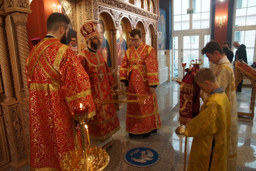 Po uroczystym powitaniu hierarchów odczytane zostały modlitwy „na odnowienie świątyni” (cs. obnowlenija chrama), które pod względem swej treści nawołują do uświęcenia nowego budynku w Duchu Świętym. Następnie po raz pierwszy w murach cerkwi garnizonowej wybrzmiały słowa: „Błogosławione Królestwo…”, będące inauguracyjną aklamacją rozpoczynającą św. Liturgię, której przewodniczyli: miejscowy hierarcha Jego Ekscelencja Najprzewielebniejszy Jakub, Arcybiskup Białostocki i Gdański oraz Jego Ekscelencja Najprzewielebniejszy Jerzy, Arcybiskup Wrocławski i Szczeciński, Prawosławny Ordynariusz Wojskowy.