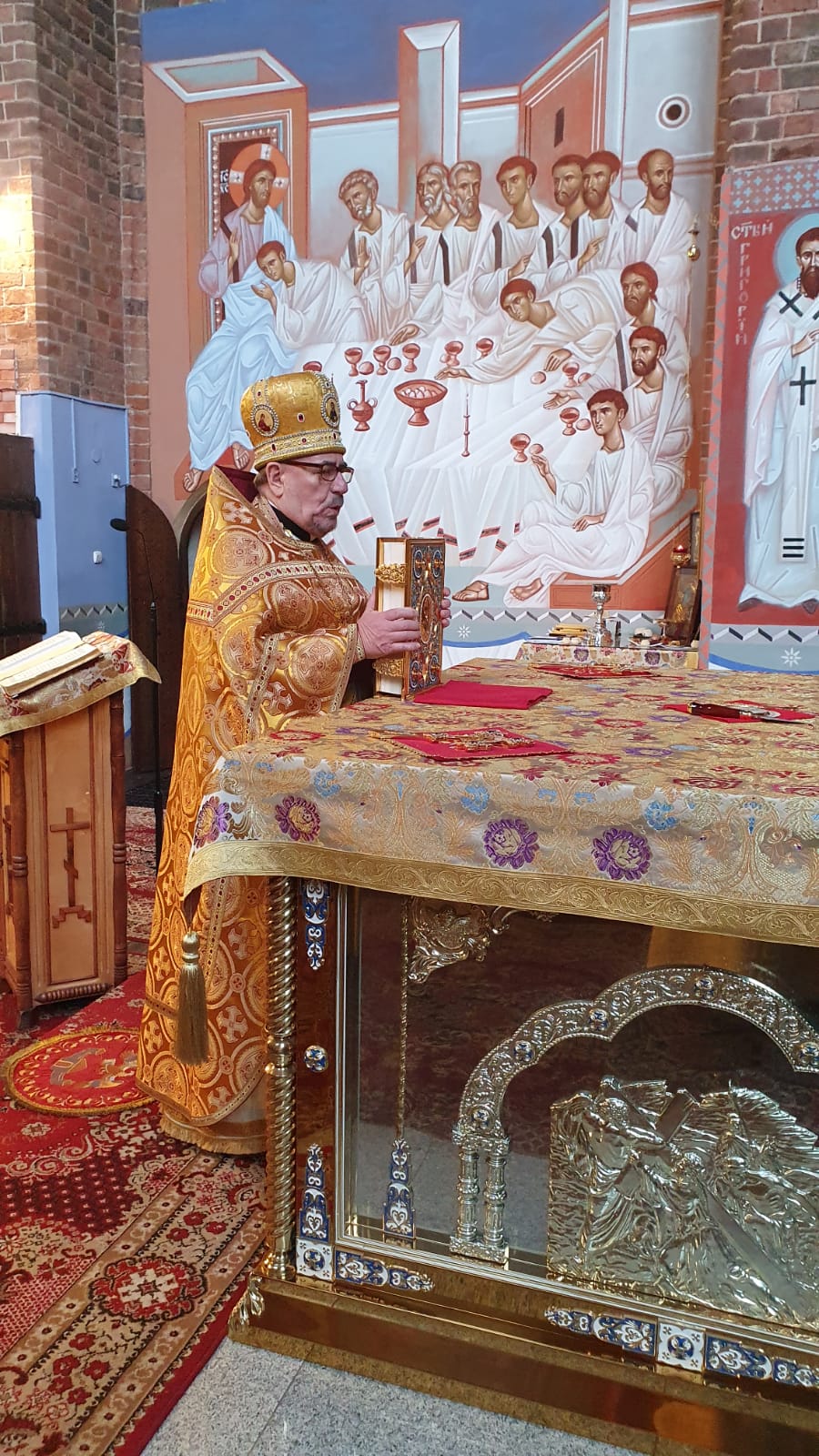 Po wysłuchaniu Ewangelii ze słowem do wiernych zwrócił się Władyka Jerzy. W swojej homilii podkreślił, że uczta, o której mowa to Wielka Niebiańska Uczta, na którą zaproszeni są wszyscy ludzie, wszystkich czasów i narodów. Gospodarzem tej uczty jest Bóg Ojciec, a sługą wysłanym po to by rozdać zaproszenia wszystkim zaproszonym jest Chrystus. Dzisiejsza Ewangelia pokazuje naszą szarą codzienność. Ucztą jest Eucharystia, na którą zaproszony jest każdy z nas. Jakże często nie przyjmujemy tego zaproszenia lub odkładamy je na dalszy czas. Ewangelia ukazuje nam trzy przykłady postaw, przez które często rezygnujemy z Boga. Aby zachować duchową równowagę musimy pokochać Boga całym swoim sercem - postawić Go w centrum naszego życia i dopiero wtedy wszystko inne zostanie postawione na swoje właściwe miejsce.
