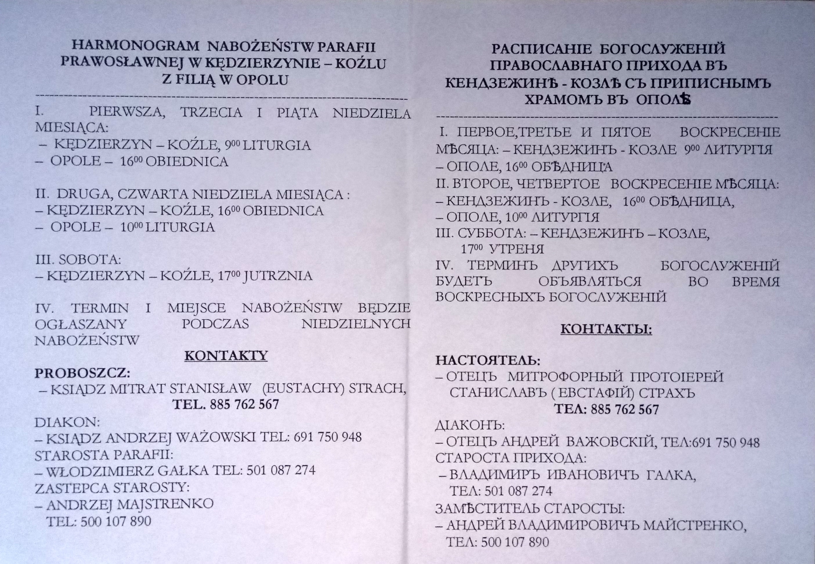 Z błogosławieństwa Jego Ekscelencji Najprzewielebniejszego Arcybiskupa Jerzego została otwarta filia parafii prawosławnej w Kędzierzynie-Koźlu z siedzibą w Opolu. Do czasu zorganizowania własnego punktu parafialnego nabożeństwa odbywać się będą w dolnej kaplicy Kościoła Rzymskokatolickiego pw. św. Apostołów Piotra i Pawła, Plac Adama Mickiewicza 1 w Opolu. Ze wszystkimi pytaniami należy zwracać się bezpośrednio do proboszcza ks. mitrata Stanisława Stracha.