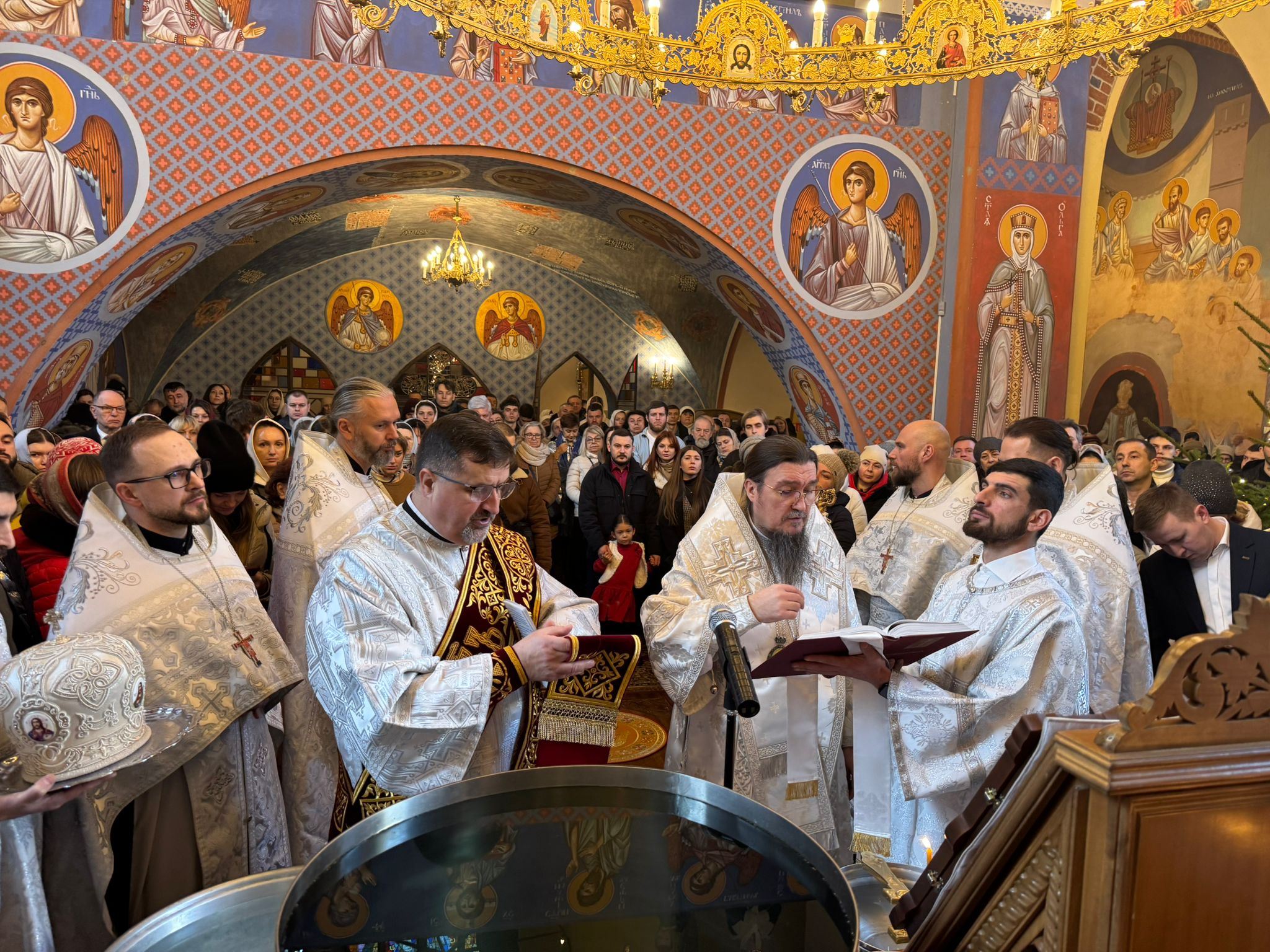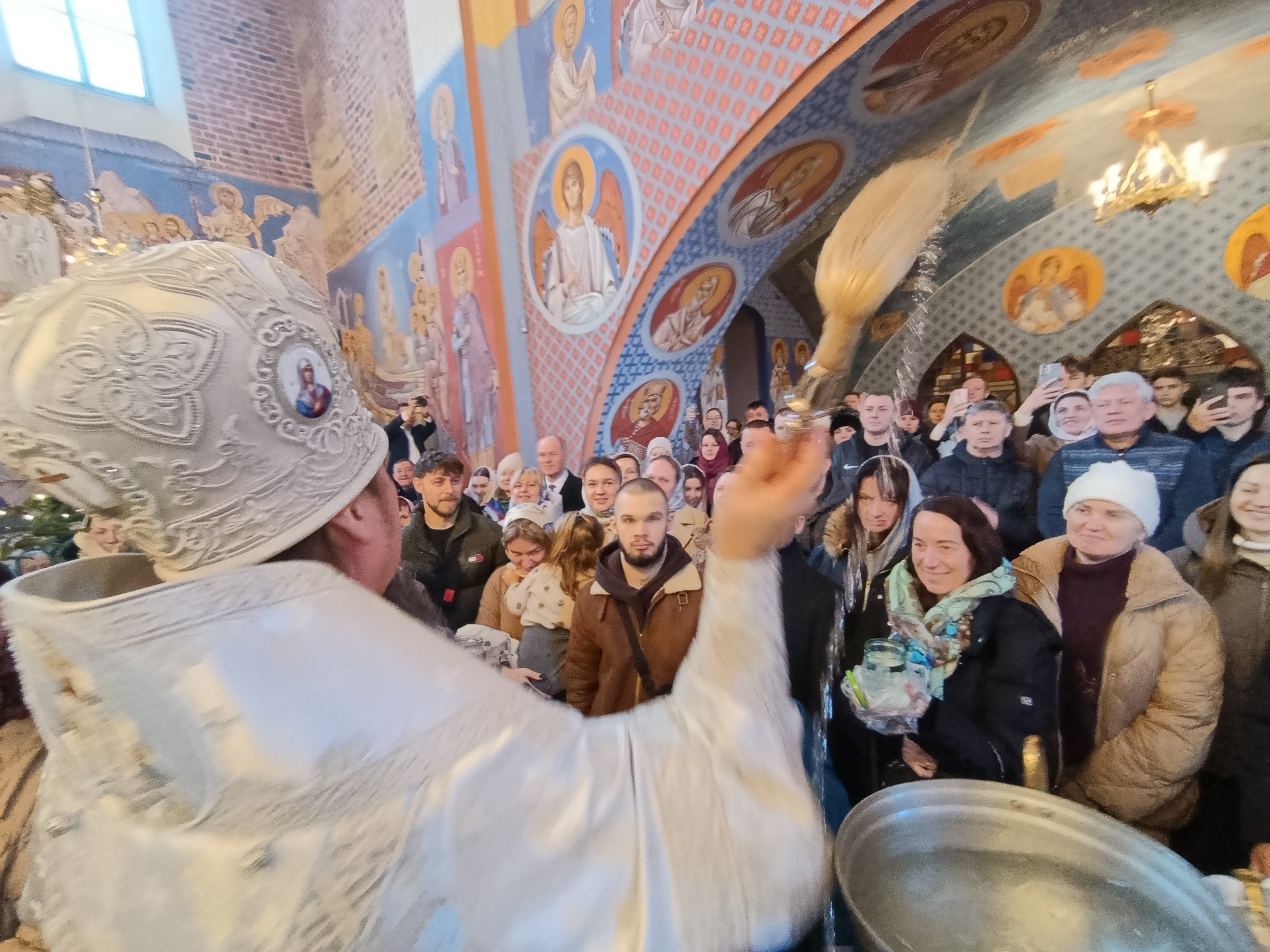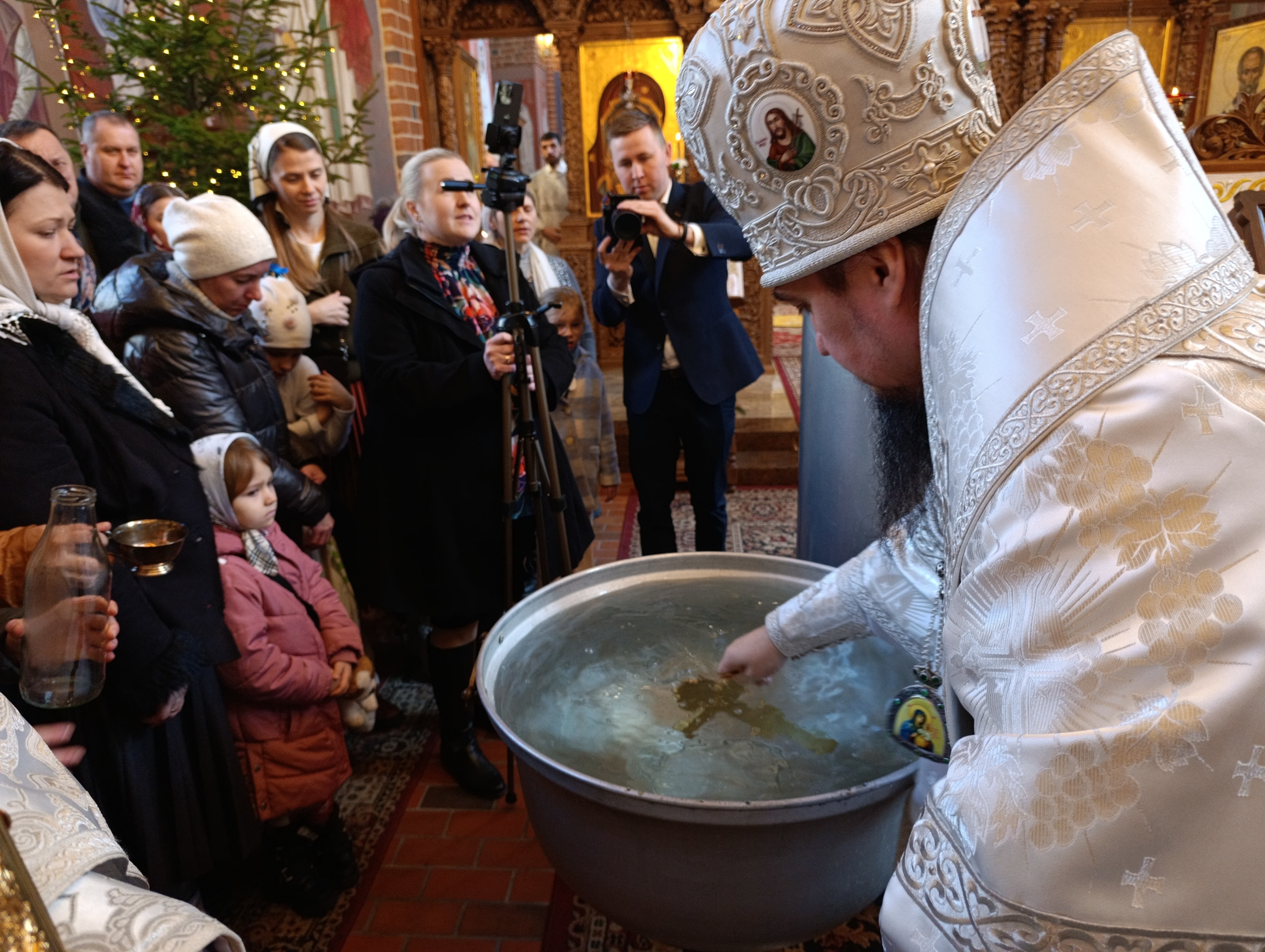 Po zakończeniu Świętej Liturgii miał miejsce obrzęd Wielkiego Oświęcenia Wody. W trakcie Oświęcenia czytane są teksty starotestamentowych proroctw, specjalne modlitwy oraz ektenie, w których wyrażana jest prośba o to, aby Bóg w swojej niezmierzonej miłości do człowieka zesłał z niebios Łaskę Świętego Ducha. Oświęcona w ten sposób woda staje się Wielką Hagiasmą, specjalną wodą oświęcaną tylko i wyłącznie z okazji święta Chrztu Pańskiego. Po zakończeniu nabożeństw Władyka Jerzy jeszcze raz zwrócił się z pozdrowieniem do wiernych dziękując im za wspólną modlitwę. Następnie w związku z przypadającym wkrótce dniem niebiańskiego patrona Władyki - św. Jerzego Chozewity, ks. Adam Góralczuk w imieniu wiernych oraz duchowieństwa złożył Jego Ekscelencji imieninowe życzenia. Dziękując za arcypasterską służbę, modlitwę oraz duchową opiekę wręczył Władyce bukiet kwiatów a chór oraz wszyscy zgromadzeni zaśpiewali gromkie “Mnohaja leta”.